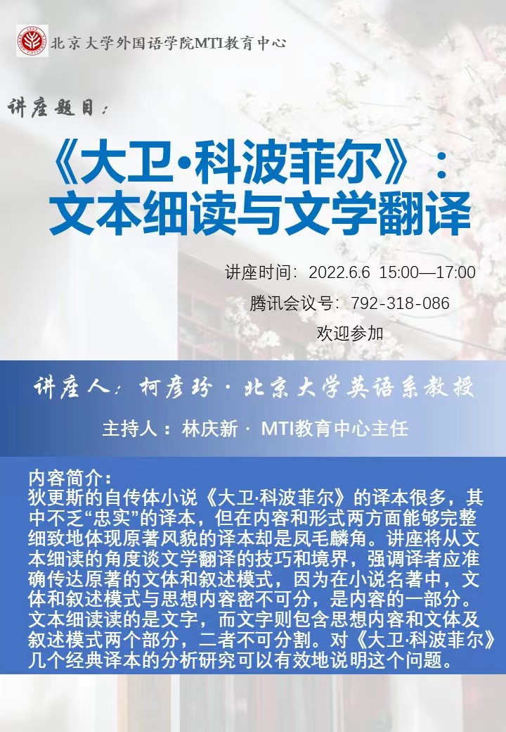《大卫·科波菲尔》:文本细读与文学翻译讲座预告