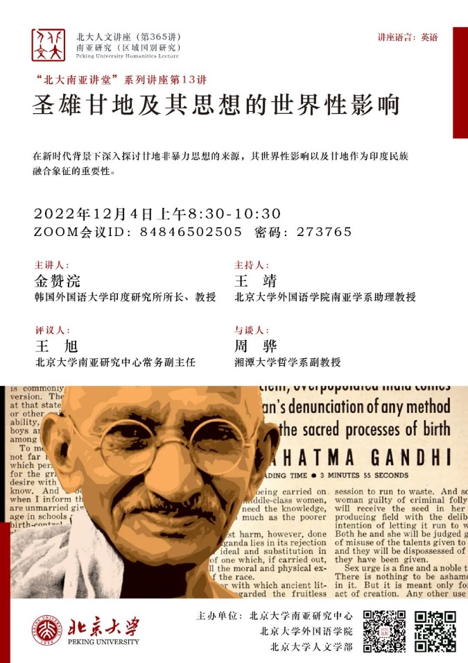 韩国外国语大学印度研究所所长金赞浣教授讲座预告:圣雄甘地及其思想的世界性影响