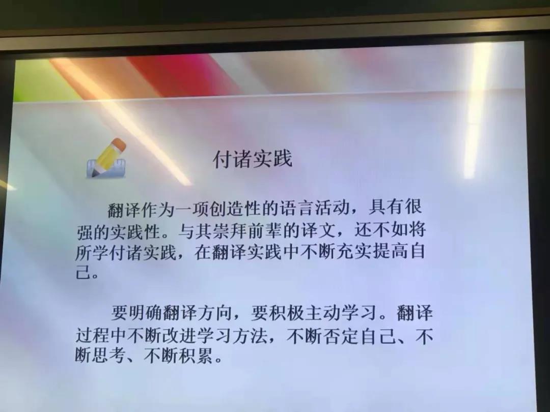 她还强调,同学们在积累的同时,也需要付诸实践。翻译作为一项创造性的语言活动,具有很强的实践性。要明确翻译方向,要积极主动地学习。翻译过程中不断改进学习方法,不断否定自己、不断思考、不断积累,坚持不懈地进步。霍娜最后总结道:中央文献翻译能力的提高并非一朝一夕之事,需要一个长期大量积累的过程。因此,中央文献的翻译工作,要花大量功夫在翻译之外,只有积累到一定量的知识,才能厚积薄发,实现质变,达成飞跃与突破。