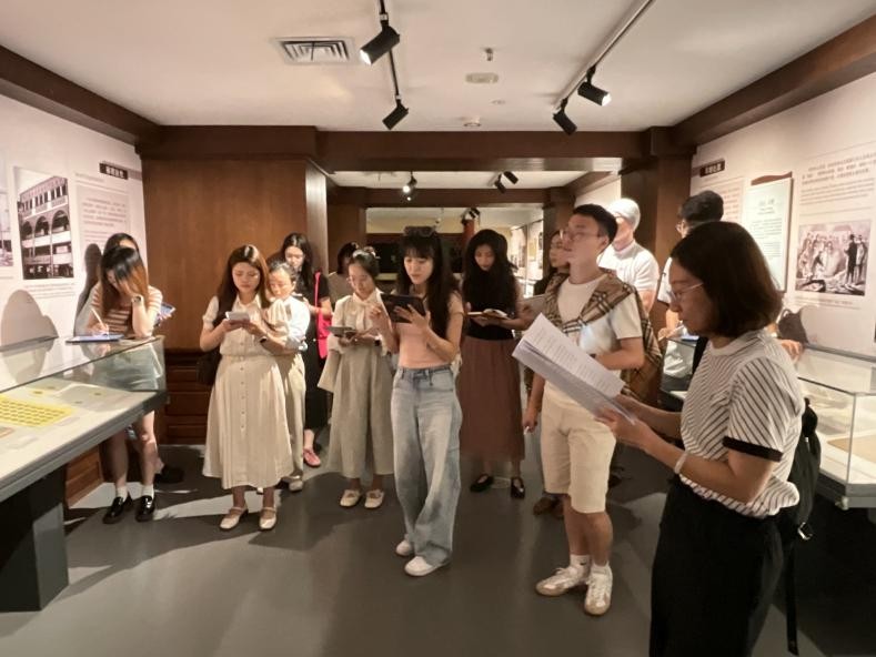 5月29日上午,外国语学院东南亚系泰语专业19名师生前往中国华侨历史博物馆开展联合实践教学活动,主要依托馆内南洋华侨华人文物及史料,开展了多模态翻译实训、口译情景模拟及文学-社会历史交互学习教学实践,以深化“泰语翻译教程”、“泰语高阶口译研究与实践”及“泰国文学史”三门专业必修课程的思政维度。本次教学活动由东南亚系泰语专业主任熊燃助理教授与万悦容副教授共同带队,参与学生涵盖本、硕两个培养层次共17人。