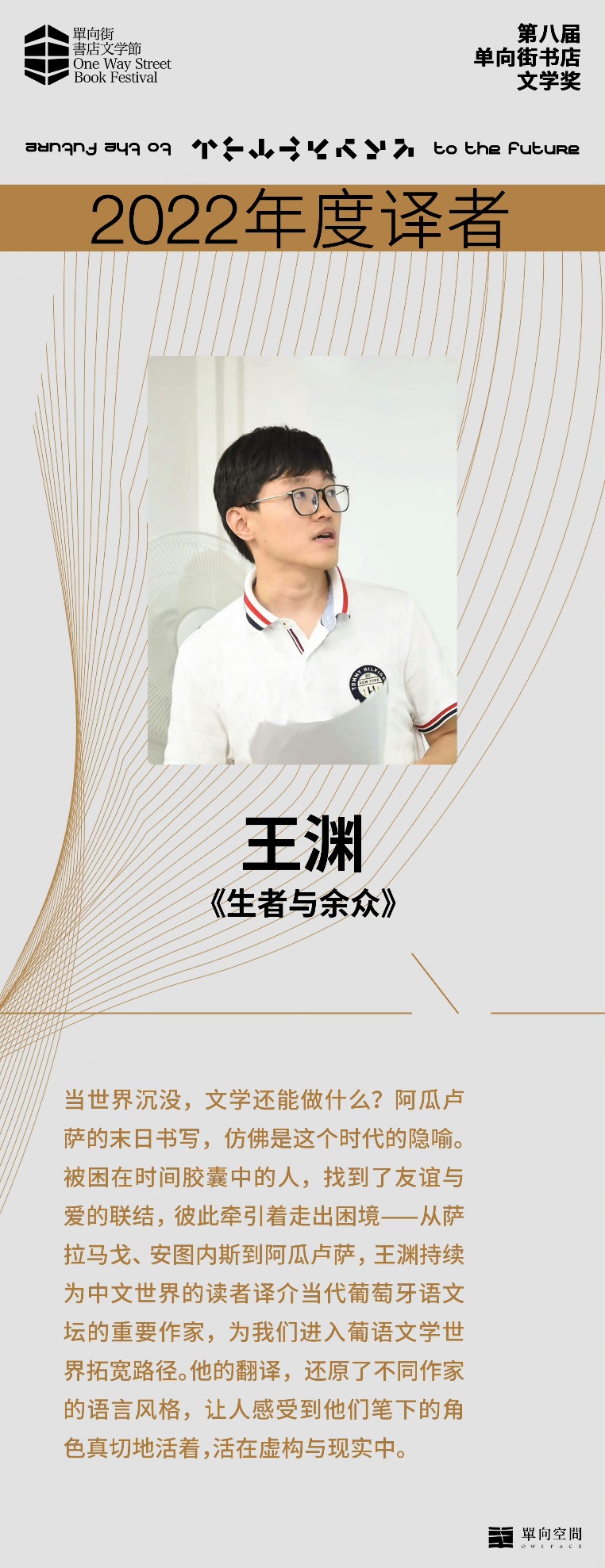 2023年3月25日,第八届单向街书店文学奖揭晓。博鱼体育王渊老师荣获2022年度译者,以表彰他对葡语文学译介及推广所做出的贡献。