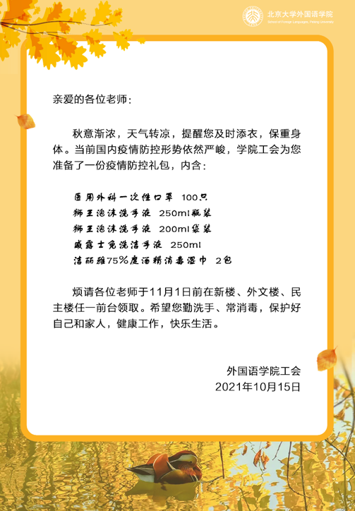 燕园的秋天悄然而至,天气渐凉,学院工会发出温馨提醒,希望老师们及时添衣,保重身体。当前国内疫情形势仍然严峻复杂,国内多个省份出现本土病例。外国语学院工会结合学校疫情防控工作要求,切实维护工会会员的健康安全,为老师们准备了防疫物资大礼包,内含医用外科一次性口罩、泡沫洗手液、免洗洁手液和酒精消毒湿巾,提醒老师们保持防护意识,在疫情防控常态化时期科学防疫,戴口罩,勤洗手,常消毒,保护好自己和家人。