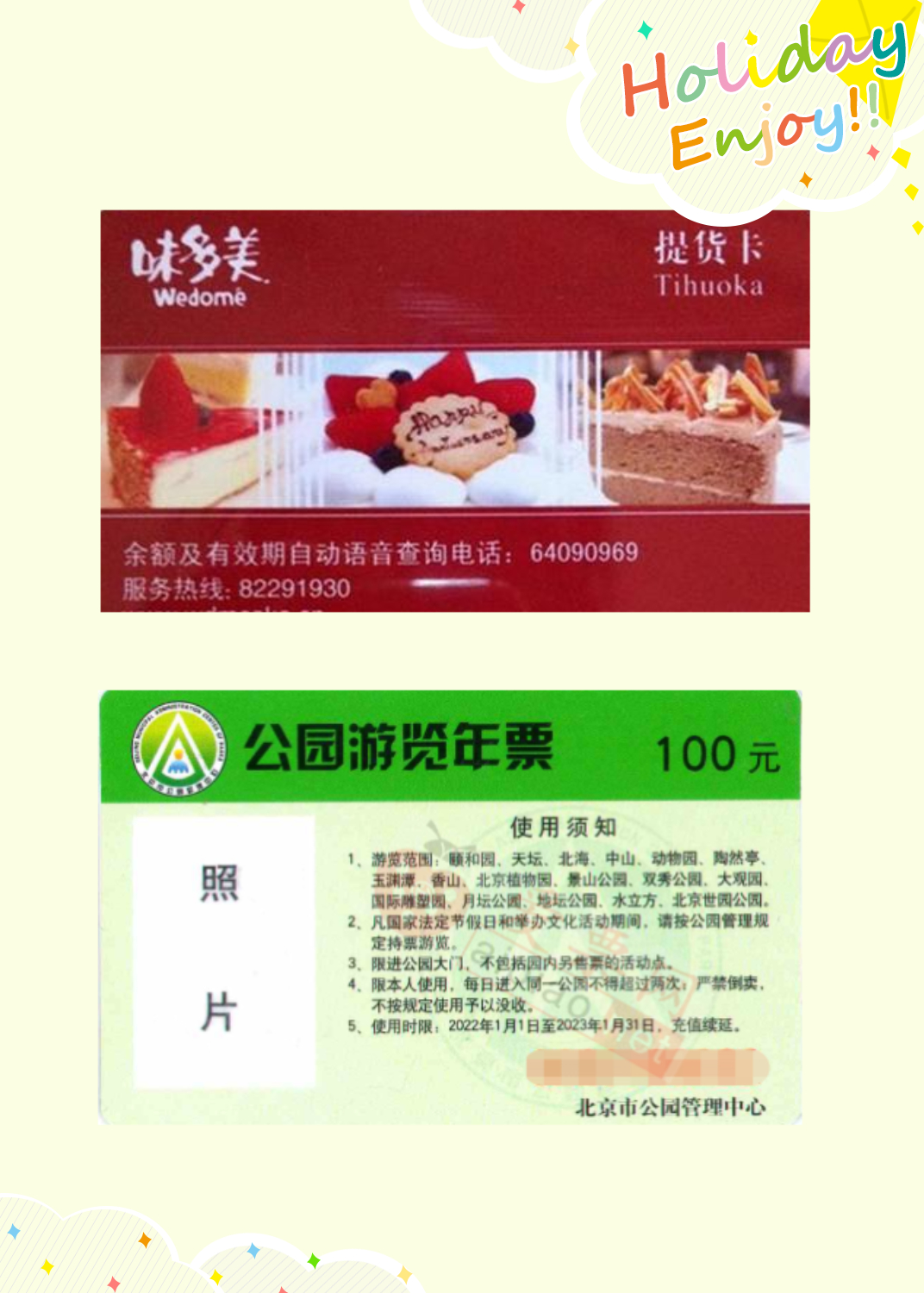 2019年疫情来临之前,外国语学院工会每年都会为本院在职和离退休教职员工及家属组织春秋游活动,已经举办了十余年,深受老师们的好评。在舒适悠闲的郊区野外,外院大家庭相聚一起,轻松愉悦地交流感情,其乐融融,格外温馨。自疫情以来,我院工会坚决执行“少外出、不聚集”的防疫号召,最大限度地保护全院教职员工的健康和安全。学院工会连续两年将往年用于组织教职工春秋游的经费灵活处理,为老师们提供北京市公园游览年票或味多美生日蛋糕卡二选一的福利方案。以上两种福利金额大致相当,为100—103元人民币。北京市公园年票适用于含颐和园、天坛公园和北京世园公园等在内的共17家市属公园。喜欢游览公园的老师只需提交一张一寸照片或将往年的公园年票交给学院工会福利委员潘桂英老师即可,由潘老师前往公园为老师们统一办理后发放给大家。生日蛋糕卡一般则是为老师们办理门店较多、便于购买的味多美蛋糕卡。