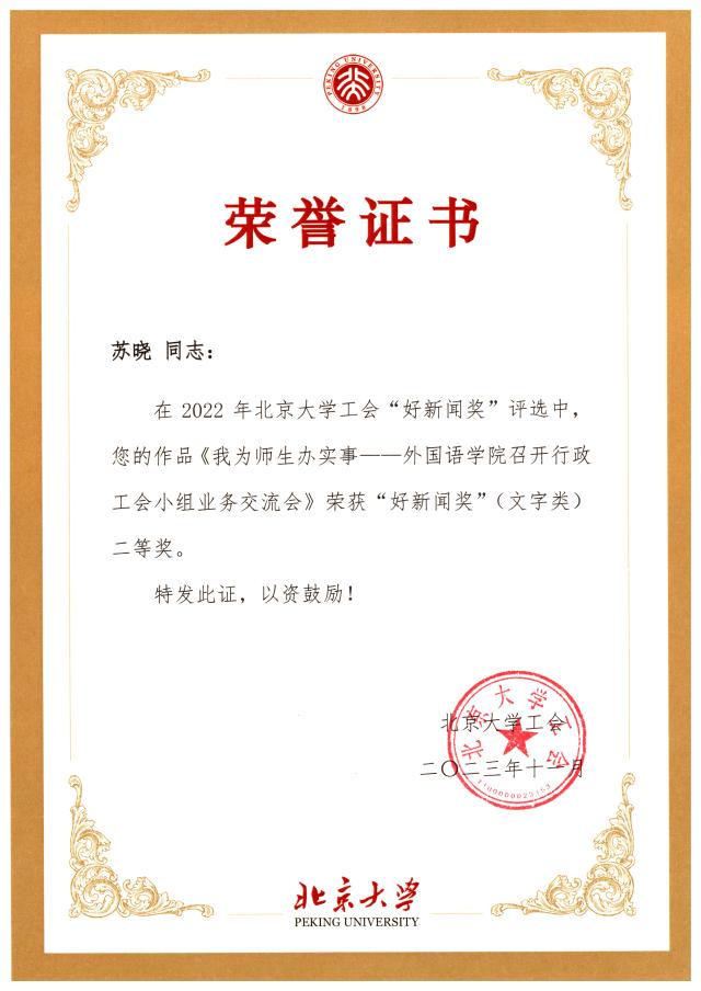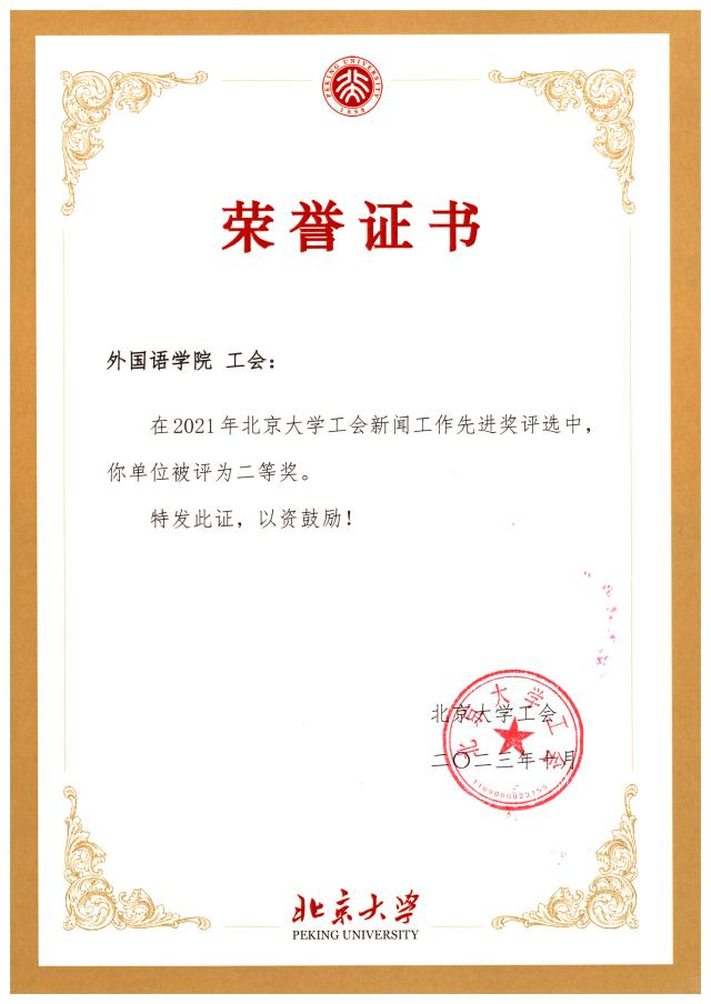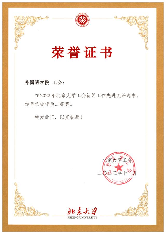 外国语学院工会高度新闻工作,多次聘请学校新闻网和宣传部的专业老师进行新闻稿写作培训和照片拍摄指导。2023年11月,特邀北京大学年鉴与统计办公室的徐聪颖老师为行政工会小组带来 “解剖一只’小麻雀’——行政工作常见文稿写作浅析”的讲座。每次工会活动之后,及时约稿、发稿,积极向校工会网站投稿,并将优秀稿件推送至北京大学新闻网进行宣传报道,连续两年荣获北京大学工会“新闻工作先进奖”二等奖。