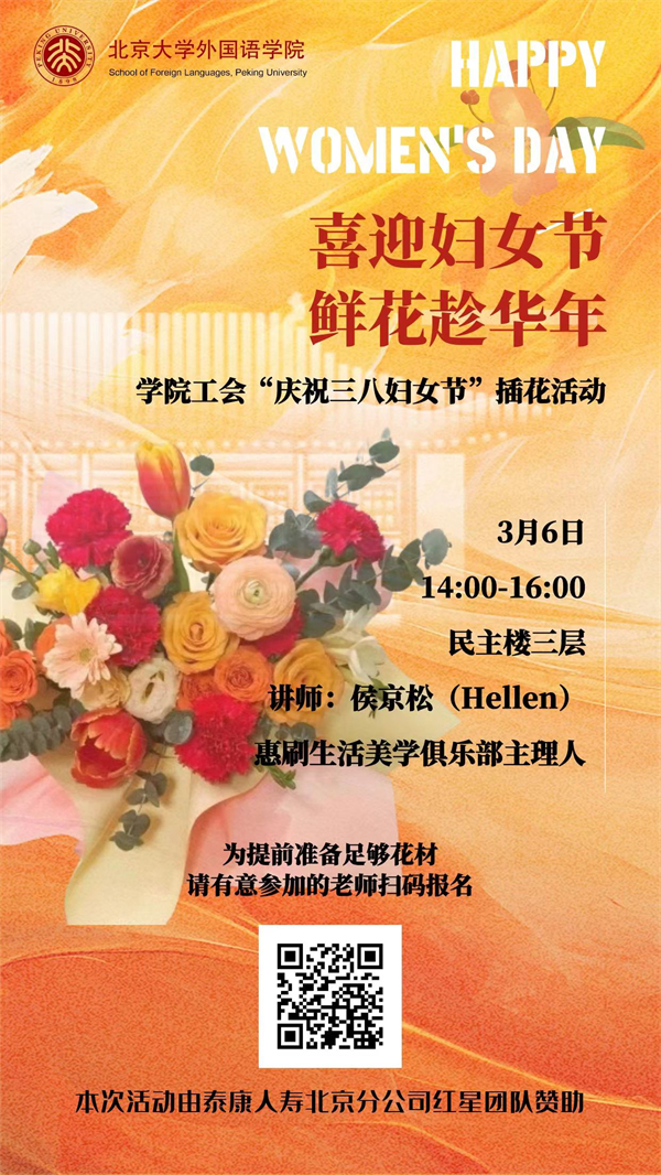 为庆祝第114个“三八”国际劳动妇女节,2024年3月6日下午,外国语学院工会在民主楼三层活动空间举办了插花教学与实践活动,学院党委副书记、工会主席张冬梅老师及学院三十余名教职工参加,北京大学工会副主席田越受邀出席。本次活动由泰康人寿北京分公司红星团队赞助支持。
