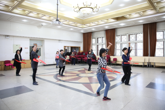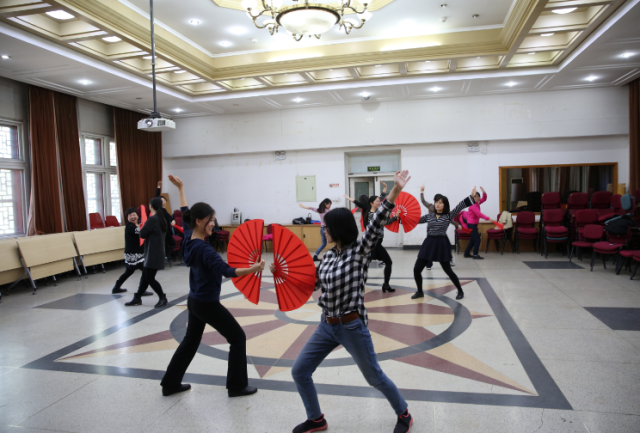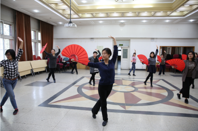 今年北京大学运动会的团体操表演项目是未名太极扇,外国语学院积极响应学校工会的号召,在工会常务副主席、副院长张冬梅老师、工会副主席刘军老师、文体委员李宁老师、女工委员鲁学彬老师、工会小教员刘水老师的带领下组织了30余人的太极扇团队,每天11:0011:30准时排练。因春季时常有雾霾天气,外院工会特提供民主楼208室内多功能厅以及多媒体设备供太极扇排练使用。