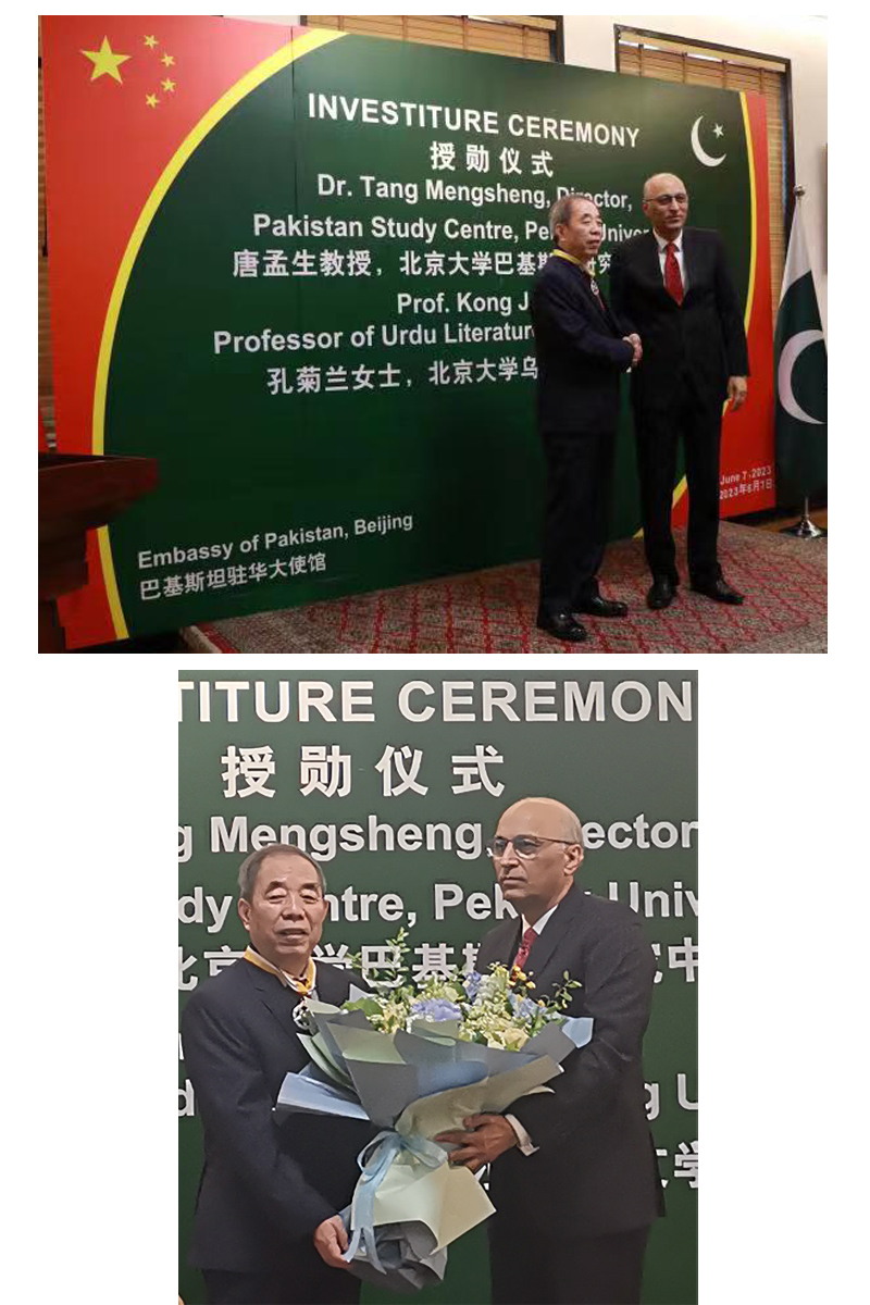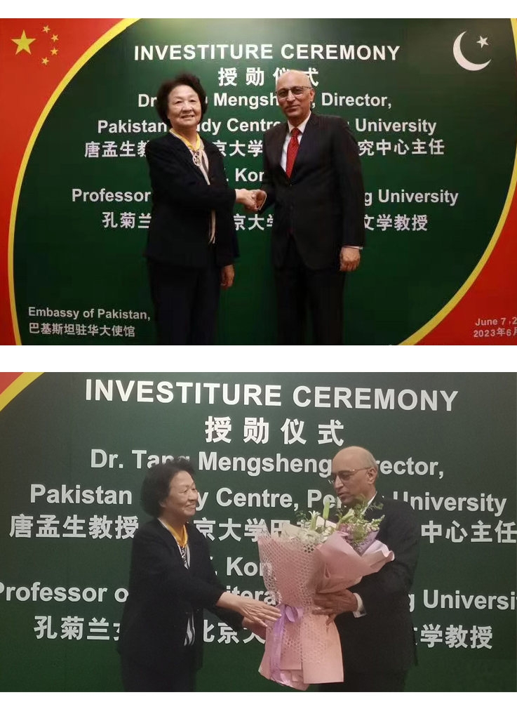 2023年6月7日,巴基斯坦驻华大使馆举办隆重仪式,授予博鱼体育南亚学系唐孟生教授与孔菊兰教授巴基斯坦“卓越之星”勋章,以表彰两位学者在推动乌尔都语教学、增进两国人文交流、增进中巴友谊方面作出的重要贡献。巴基斯坦驻华大使莫因·哈克、政务参赞穆罕默德·卢曼·艾哈迈德、武官Ranna Faisal Rafiq准将、社会福利公使Ijaz Ahmad、科技公使Kamran Rasheed博士,以及原中国驻(巴基斯坦)卡拉奇总领事安启光、三峡集团财务总监王少峰等各界人士出席了授勋仪式。