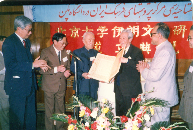 伊朗驻华大使及文化参赞与《波斯经典文库》的译者在北京大学的首发式上(2002)