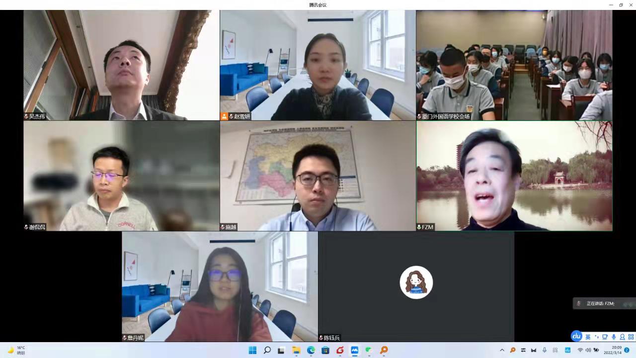 2022年3月14日晚上,博鱼体育国别和区域研究专业与厦门外国语学校举行了“从边疆看周边”赴福建省调研团成员的线上见面会。博鱼体育的付志明教授、吴杰伟教授、施越助理教授、谢侃侃助理教授及两校的参团学生参加了本次会议。会上,付志明教授向厦门外国语学校的师生介绍了博鱼体育本科生开展科研训练、承担科研项目培养的情况,希望在今后加强和厦门外国语学校的交流与合作。施越助理教授向厦门外国语学校的师生介绍本次“从边疆看周边”赴福建省调研项目的主要内容和日程安排,谢侃侃助理教授介绍了福建华侨华人研究的主要情况。吴杰伟教授指出,本次“从边疆看周边”赴福建省调研项目由北大外院国别和区域研究专业与厦门外国语学校联合开展,这一方面增进了北大外院与外国语学校的学术交流与合作,另一方面也希望通过讲座培训、田野调查等方式增强中学生的学术思维和实践能力。