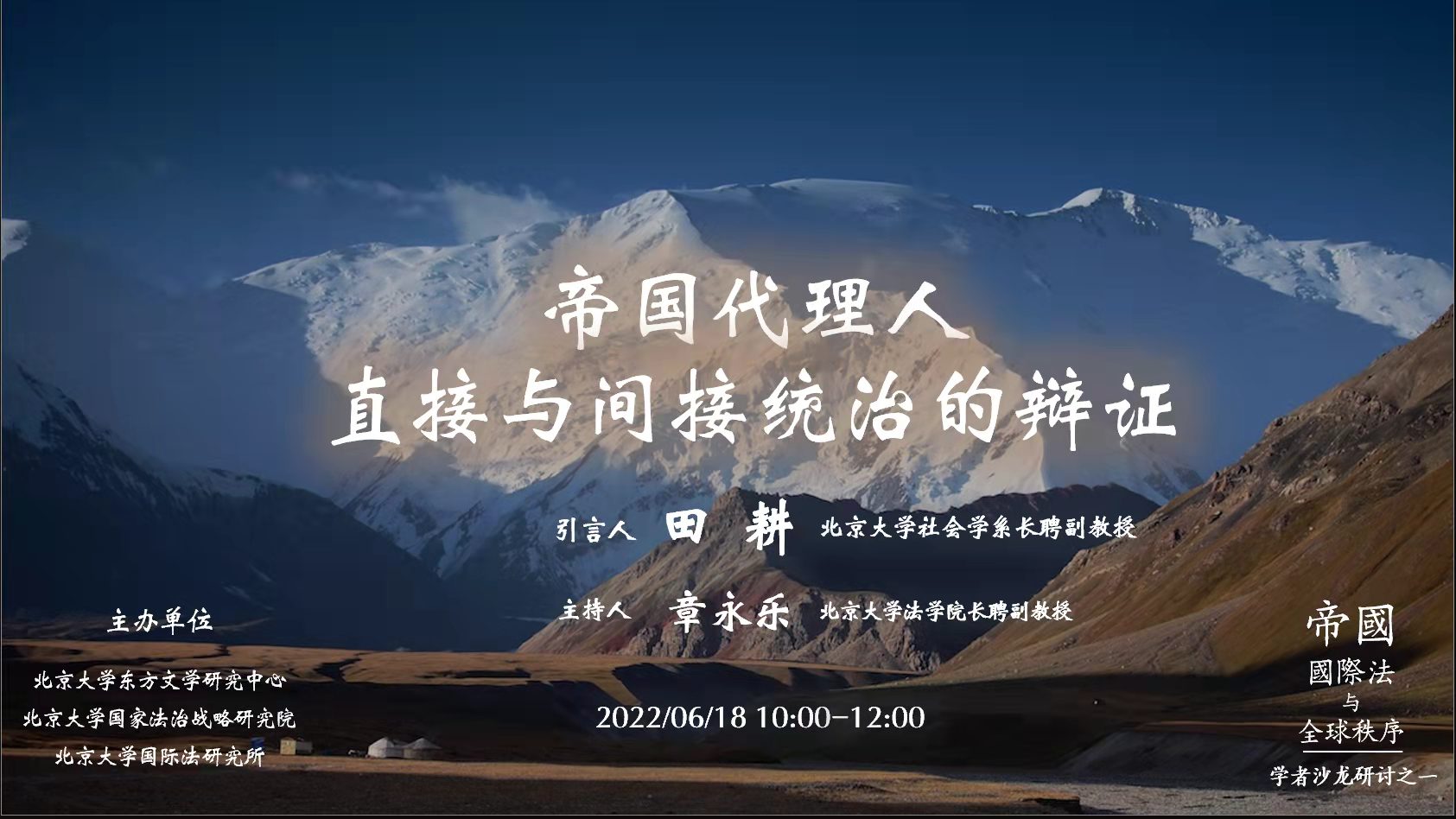 2022年6月18日上午,由北京大学东方文学研究中心、北京大学国家法治战略研究院和北京大学国际法研究所联合发起的学者沙龙于线上、线下成功举行。本次讲座以“帝国代理人:直接与间接统治的辨证”为题,由北京大学社会学系长聘副教授田耕作引言,北京大学法学院长聘副教授章永乐主持。博鱼体育院长陈明教授、副院长吴杰伟教授、助理教授施越、张忞煜和谢侃侃,新闻与传播学院王维佳副院长,国际关系学院赖华夏助理教授,政府管理学院罗祎楠助理教授,法学院博士后陈晓航以线下形式参与;清华大学宋念申教授、中国社会科学院欧洲研究所孔元副研究员、人民大学法学院刘洋助理教授、北京大学历史学系昝涛长聘副教授、法学院陈一峰副教授、国际关系学院雷少华副教授等专家学者通过线上形式参与。