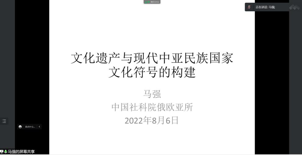 接下来,三位主讲嘉宾分别结合各自的研究成果、研究经历和学术观点进行深入分析和阐释。马强老师首先作了主题报告。马老师在俄罗斯有长期的人类学研究经历,在推动人类学和区域研究方面有着丰富经验。此次分享,马老师从自己在吉尔吉斯斯坦访问的经历谈起,为与会师生介绍了中亚国家独立后的民族国家构建过程,并结合世界文化遗产运动,深入探讨了文化遗产塑造下文化符号的构建。中亚国家各类文化遗产突出了主体民族文化特征,展现出独特的文化空间及文化遗产体系的构建,各国积极申报世界文化遗产和世界自然遗产,凸显中亚地区多元文化交融的特征。