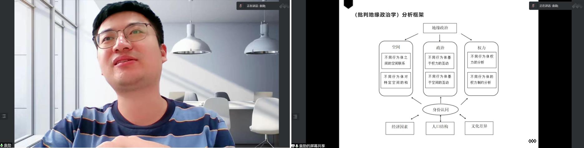袁勋老师有多年留俄经历,师从俄罗斯著名学者、莫斯科国立大学政治系教授茨冈科夫,现从事欧亚地区政治和国际关系领域的研究。此次报告,袁老师以哈萨克斯坦为例,从地缘政治的视角探讨中亚民族语言文字改革和民族意识形成等问题,并结合大量史实和事例深入解读。他强调,不同行为体借助自身话语权对特定地方、空间进行构建,从而对政治产生影响,而同时,空间政治格局和权力体系的变化又会对空间内的行为体认知产生影响,每一种地缘战略理论都是在分析特定时期特定国家面临的特定地缘环境。