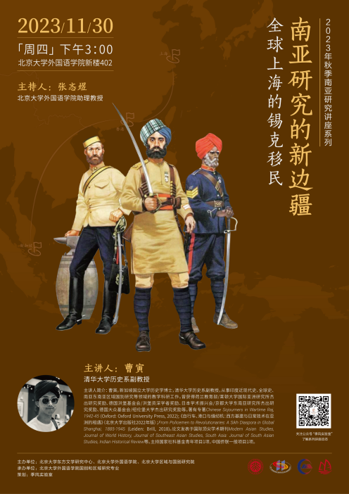 2023年11月30日,清华大学历史系副教授曹寅老师应邀为我校师生进行题为“南亚研究的新边疆——全球上海的锡克移民”的讲座。本次讲座是由北京大学东方文学研究中心、外国语学院和区域与国别研究院主办,外国语学院国别和区域研究专业承办的2023年秋季学期南亚研究系列讲座的第四讲。讲座由博鱼体育张忞煜助理教授主持,外国语学院谢侃侃助理教授出席本次讲座并参与讨论。