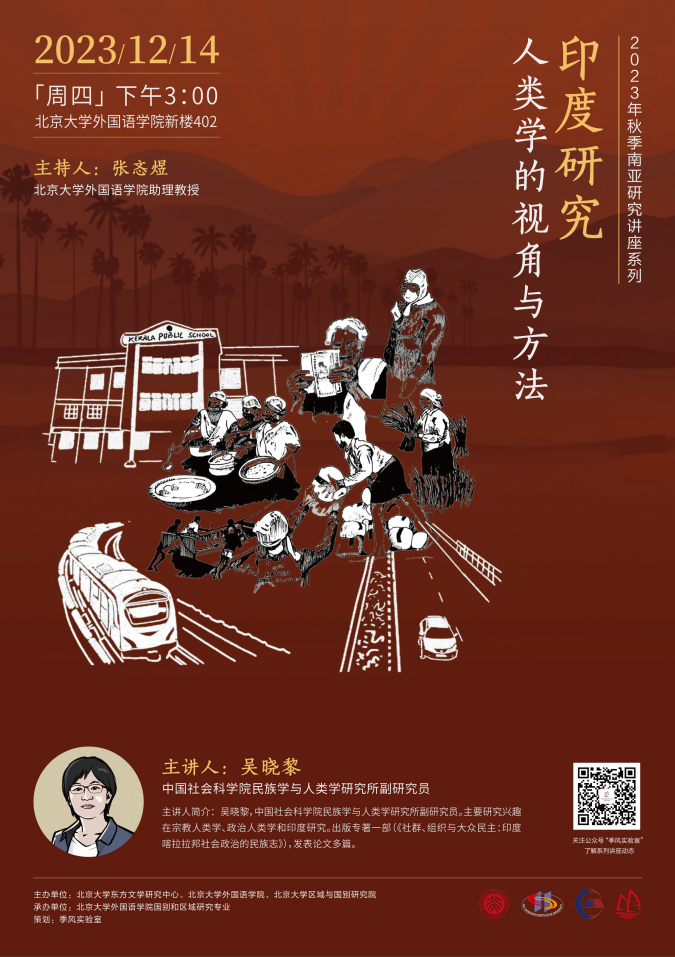 2023年12月14日,中国社会科学院民族学与人类学研究所吴晓黎副研究员应邀为我校师生进行题为“印度研究:人类学的视角与方法”的讲座。本次讲座是由北京大学东方文学研究中心、外国语学院和区域与国别研究院主办,外国语学院国别和区域研究专业承办的2023年秋季学期南亚研究系列讲座的第五讲。讲座由博鱼体育张忞煜助理教授主持,中国人民大学国际关系学院曹德军副教授、北京外国语大学区域与全球治理高等研究院许娟助理研究员出席本次讲座并参与讨论。