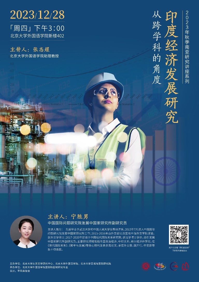 2023年12月28日,中国国际问题研究院发展中国家研究所副研究员宁胜男老师应邀为我校师生进行题为“印度经济发展研究——从跨学科的角度”的讲座。本次讲座是由北京大学东方文学研究中心、外国语学院和区域与国别研究院主办,外国语学院国别和区域研究专业承办的2023年秋季学期南亚研究系列讲座的第六讲。讲座由博鱼体育张忞煜助理教授主持,上海外国语大学国际关系与公共事务学院陈金英教授参与讨论。