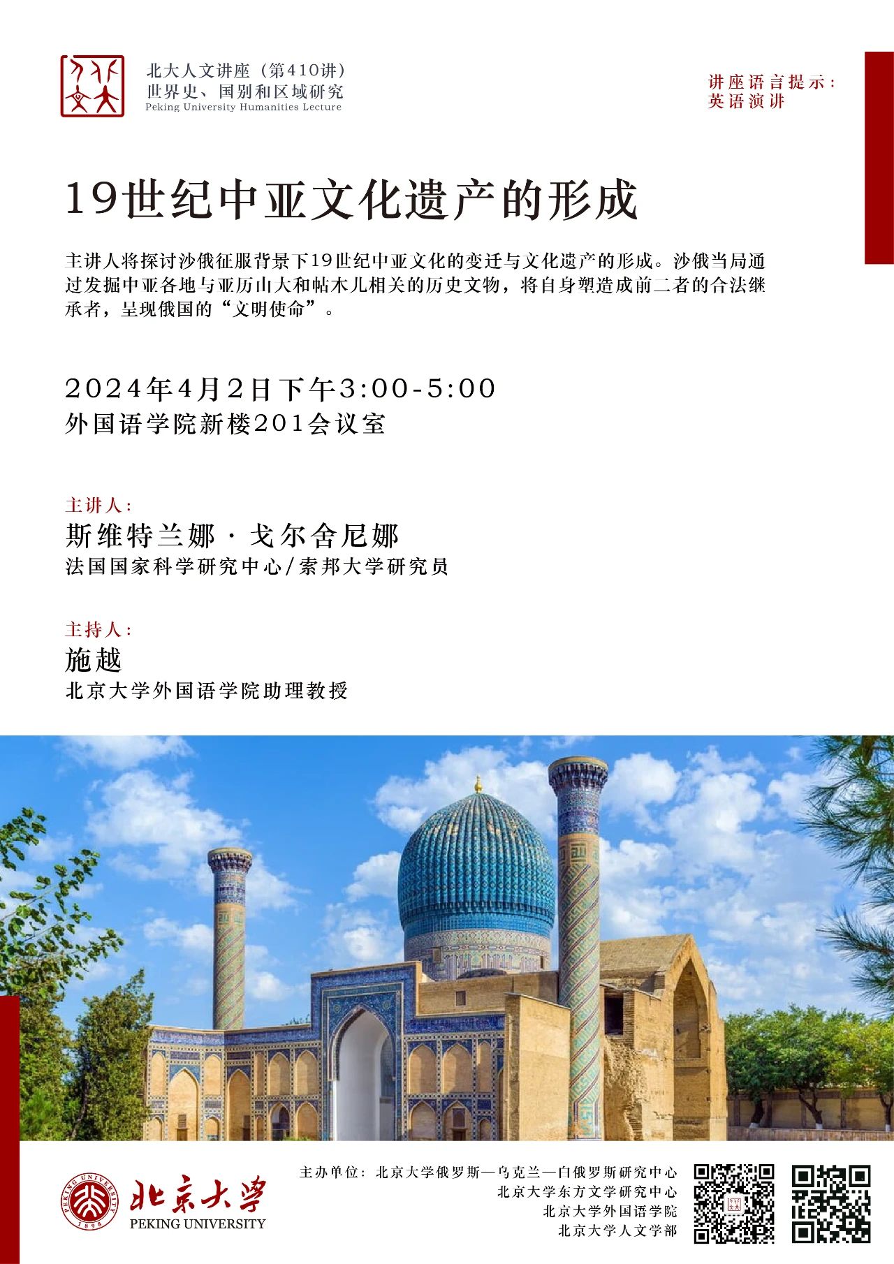 2024年4月2日,法国国家科学研究中心/索邦大学斯维特兰娜·戈尔舍尼娜(Svetlana Gorshenina)研究员做了题为“19世纪中亚文化遗产的形成”的讲座。本期讲座由北京大学俄罗斯-乌克兰-白俄罗斯研究中心、北京大学东方文学研究中心、博鱼体育和北京大学人文学部主办,博鱼体育施越助理教授主持,中国社会科学院世界历史研究所侯艾君研究员、北京大学历史学系昝涛教授、庄宇长聘副教授受邀担任与谈人。