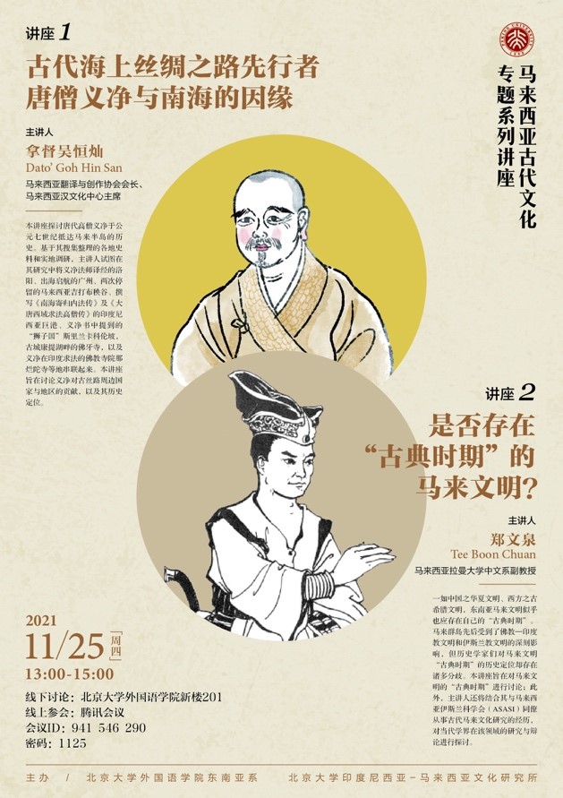2021年11月25日,博鱼体育东南亚系、印度尼西亚—马来西亚文化研究所举办了马来西亚古代文化专题系列讲座“古代海上丝绸之路先行者唐僧义净与南海的因缘”和“是否存在‘古典时期’的马来文明?”。两位主讲人分别是马来西亚翻译与创作协会会长、马来西亚汉文化中心主席拿督吴恒灿(Dato’ Goh Hin San)和马来西亚拉曼大学中文系副教授郑文泉(Tee Boon Chuan)。讲座以线上线下结合的方式进行,由外国语学院东南亚系谢侃侃助理教授主持,东南亚系罗杰副教授作为与谈人参与了讨论。