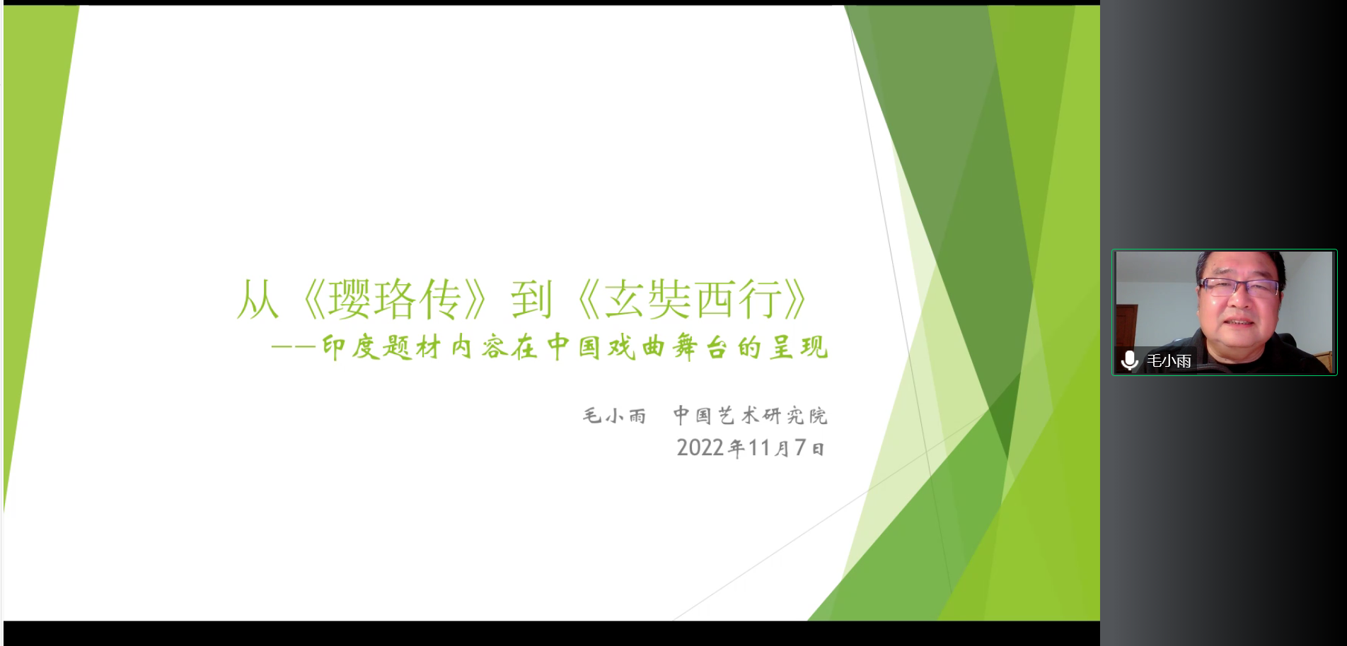 2022年11月7日晚,“东方大文学”系列讲座第十二讲“从《璎珞传》到《玄奘西行》——印度题材内容在中国戏曲舞台的呈现”在线上成功举办。本次讲座由教育部人文社科重点研究基地北京大学东方文学研究中心主办,博鱼体育南亚学系协办,中国艺术研究院戏曲研究所研究员毛小雨担任主讲人,博鱼体育副教授张嘉妹担任主持人,博鱼体育助理教授张忞煜担任评议人。