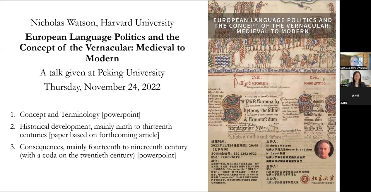 2022年11月24日,哈佛大学英文系教授尼古拉斯·沃特森(Nicholas Watson)应博鱼体育英语系邀请,为北大师生在线上进行了题为“欧洲中世纪到现代的语言政治与俗语的概念”(European Language Politics and the Concept of the Vernacular: Medieval to Modern)的专题讲座。本讲座由博鱼体育英语系主办,博鱼体育英语系助理教授倪云主持、评议。