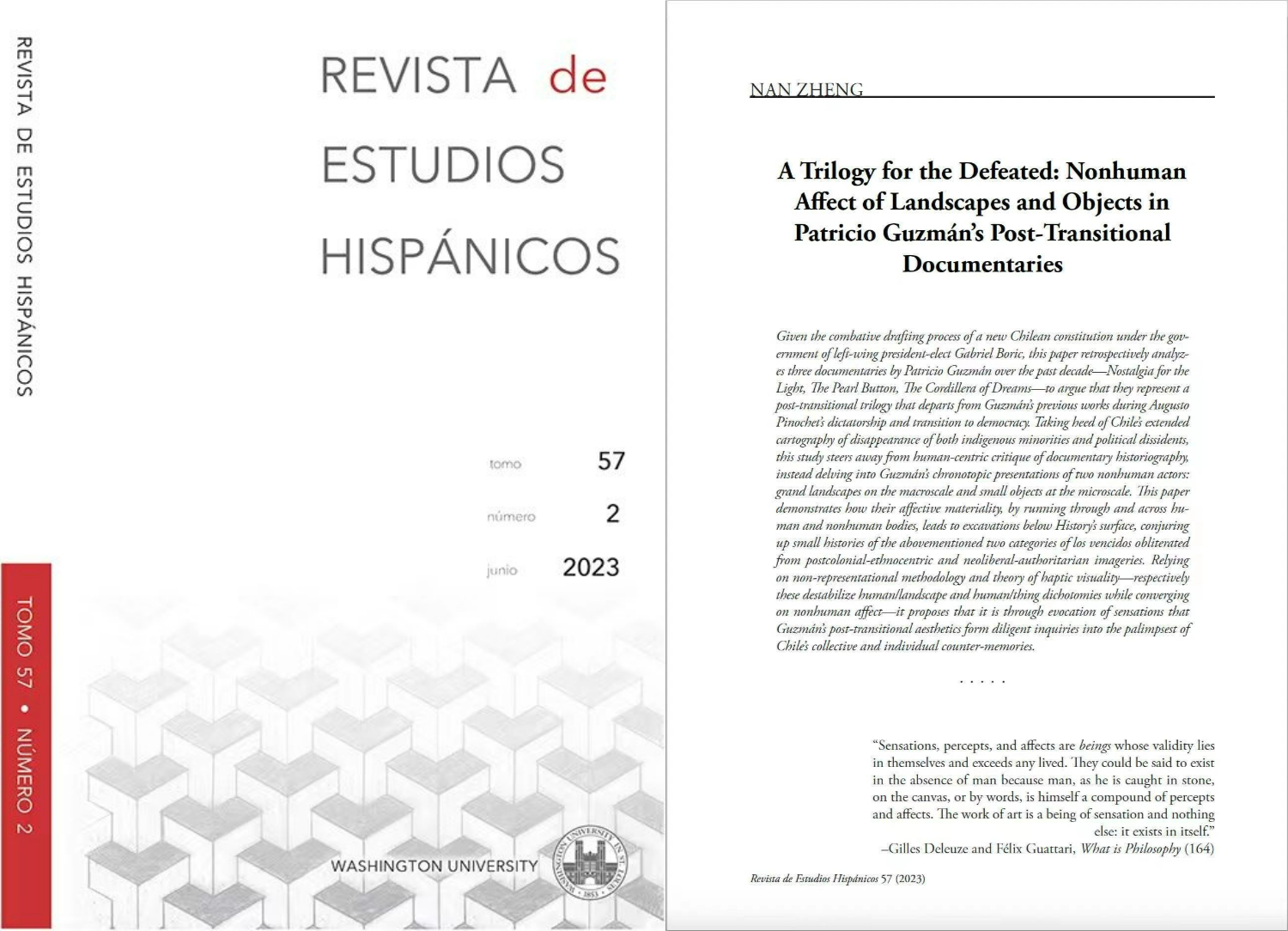 博鱼体育西葡意语系助理教授郑楠作为唯一作者的学术研究型论文《献给战败者的三部曲:帕特里西奥·古斯曼民主过渡后纪录片中风景与物件的非人类情动》(“A Trilogy for the Defeated: Nonhuman Affect of Landscapes and Objects in Patricio Guzmán’s Post-Transitional Documentaries”),近期在A&HCI来源期刊《西班牙语世界研究期刊》( Revista de Estudios Hispánicos )2023年第2期刊登。《西班牙语世界研究期刊》由美国圣路易斯华盛顿大学罗曼语语言文学系主办,采用严格的多轮匿名审稿制度,刊登西班牙语国家和地区文学和文化研究、电影研究和文艺理论批评研究等方向的西班牙语或英语学术论文。该期刊现位列JCR期刊引证报告罗曼语文学研究类一区,是国际学术研究界公认的权威期刊。郑楠老师的论文是该期刊自1967年创刊以来中国学者的首次发表,也是国际权威学术期刊第一篇整体研析古斯曼纪录片三部曲并尝试命名的学术研究型论文。