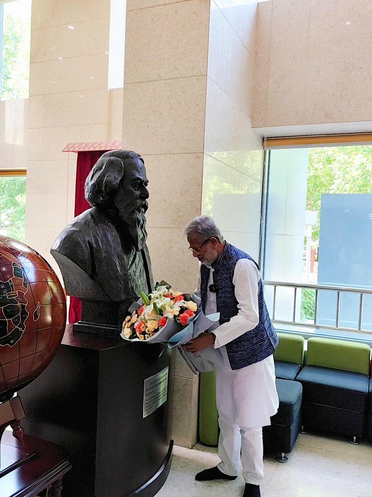 萨卡尔教授向泰戈尔雕像献花