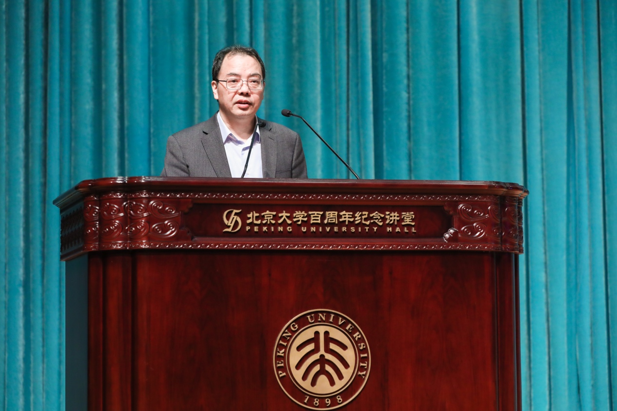 在热烈的掌声中,院长陈明为新生送上真挚的开学寄语。他以“怎样做好一名北大外院人”为锚,从专业学习、价值坚守、责任担当三个方面表达了对新生的鼓励与期待。陈老师细数外院前辈的闪光足迹,指出“语言不仅是交流的基础,更是文化的载体和思想的媒介”,鼓励同学们利用图书馆的丰富资源,潜心钻研,夯实基础,拓展视野。陈老师还从时代纵深出发,结合抗战译作振奋精神、万隆会议促进共识等事例,指出外语学习有助于深刻理解中国、从容对话世界,寄语新生成为有立场、有思考、有温度的外语人。最后,他叮嘱同学们不要忘记肩负的历史使命,积极把握外院的资源与平台,为促进中外文明交流互鉴、推动构建人类命运共同体贡献青春力量,谱写青春华章。
