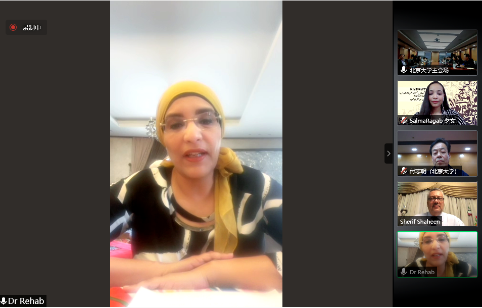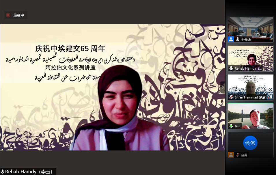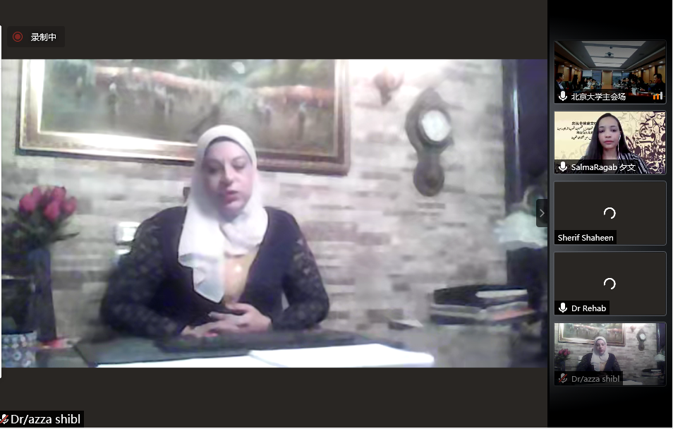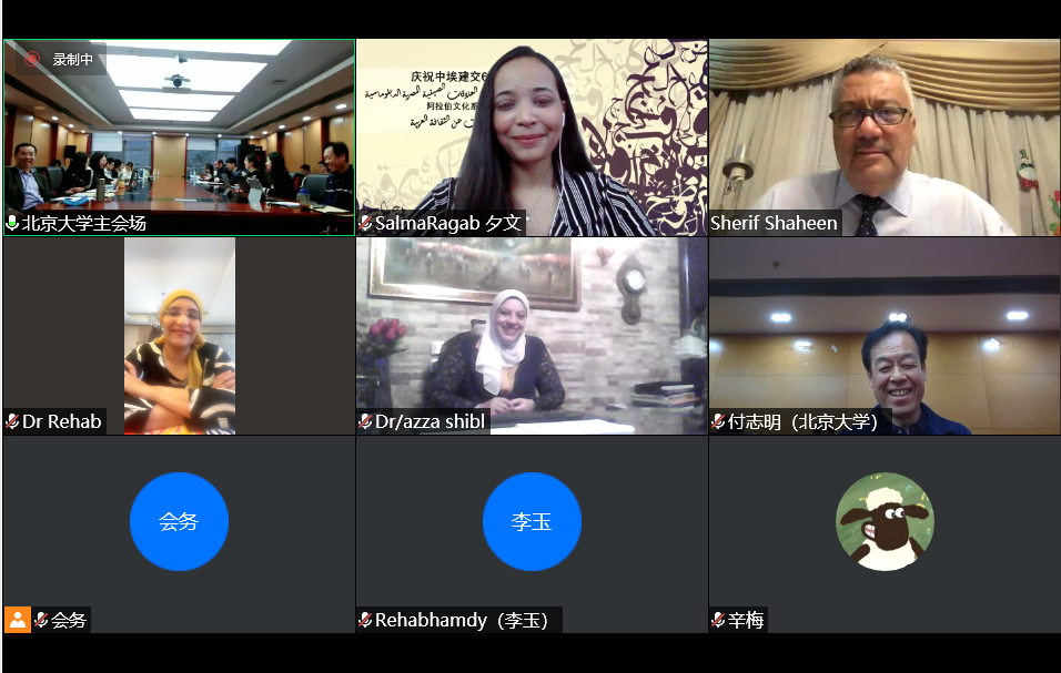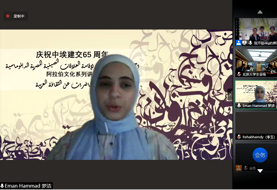 为庆祝中埃建交65周年,继成功举办北京大学与开罗大学“中国文化春令营”活动之后,两校又进行了新一轮的合作,于5月7日至8日联合举办“阿拉伯文化春令营”系列讲座。本次系列讲座线上线下协同进行。出席开幕式的有开罗大学文学院院长谢里夫•沙欣(Sherief Shahin)、文学院中文系主任兼孔子学院院长李哈布(Rehab),文学院阿拉伯语系教授阿扎•席波乐(Azza Shebl),中文系教师李玉(Rehab)、梦洁(Eman)、夕文(Salma),博鱼体育副院长付志明、阿拉伯语系主任林丰民、叙利亚籍专家哈穆德•优尼斯(Hamoud Younes)、叙利亚籍专家赛米拉•萨拉玛(Samira Salami)、阿拉伯语系长聘副教授廉超群、讲师袁琳、助理教授李海鹏、埃及籍博士后高山(Alaa Mamdouh Akef)及阿拉伯语系40余名学生。