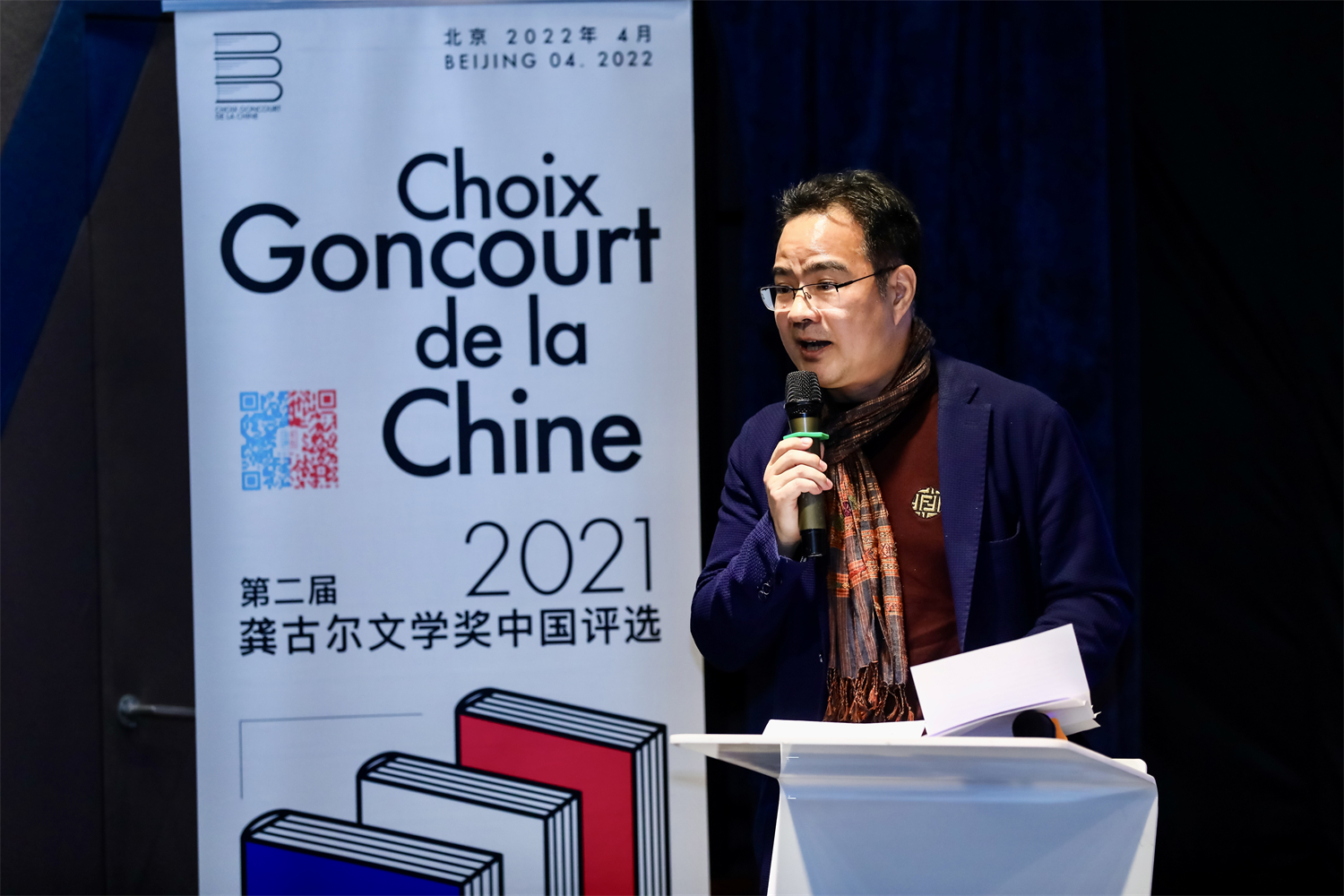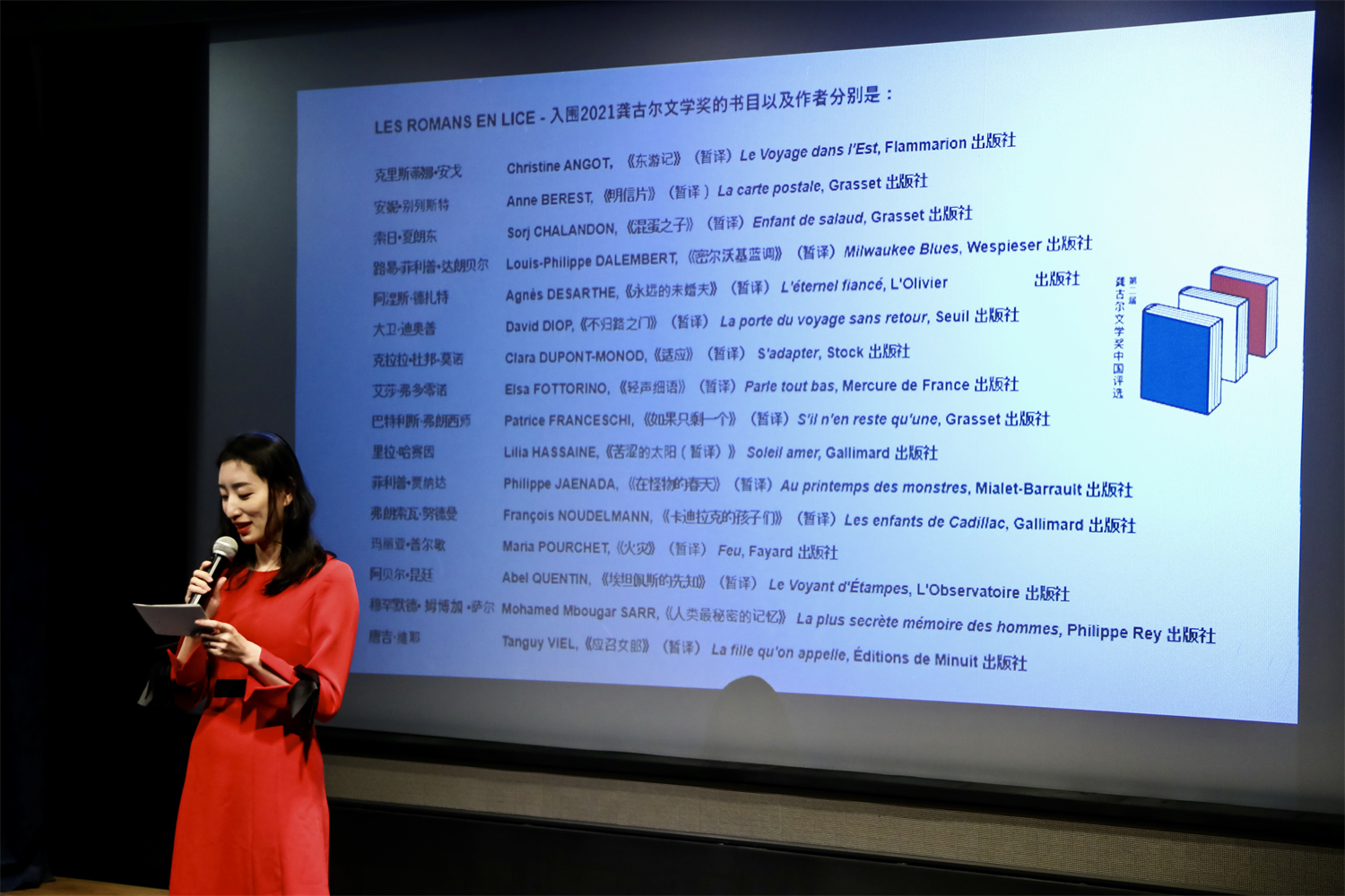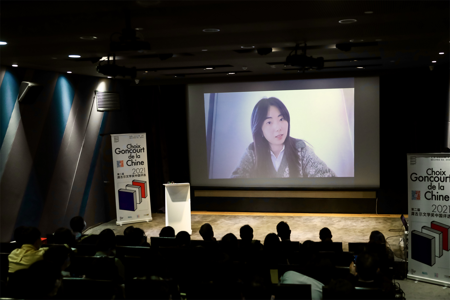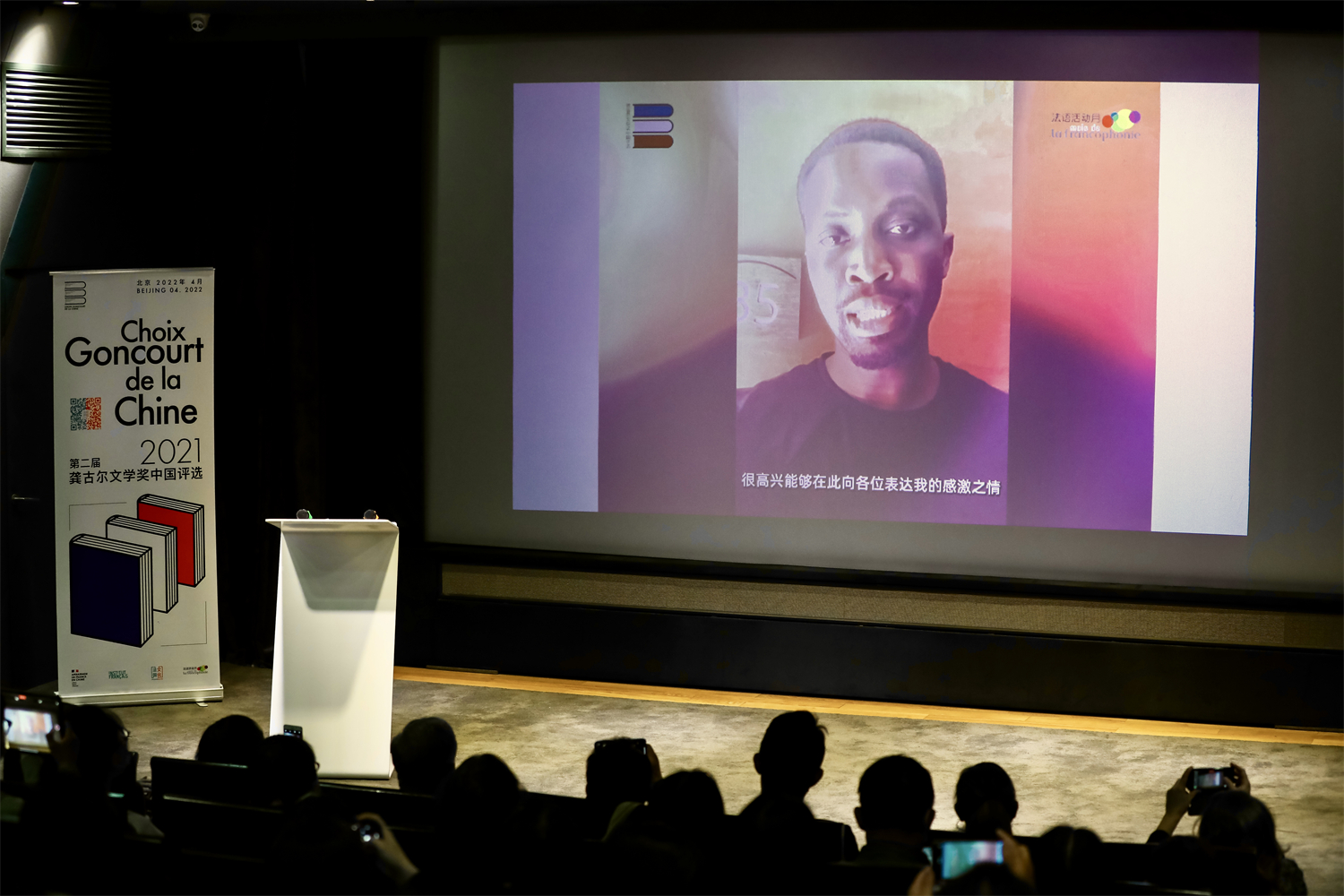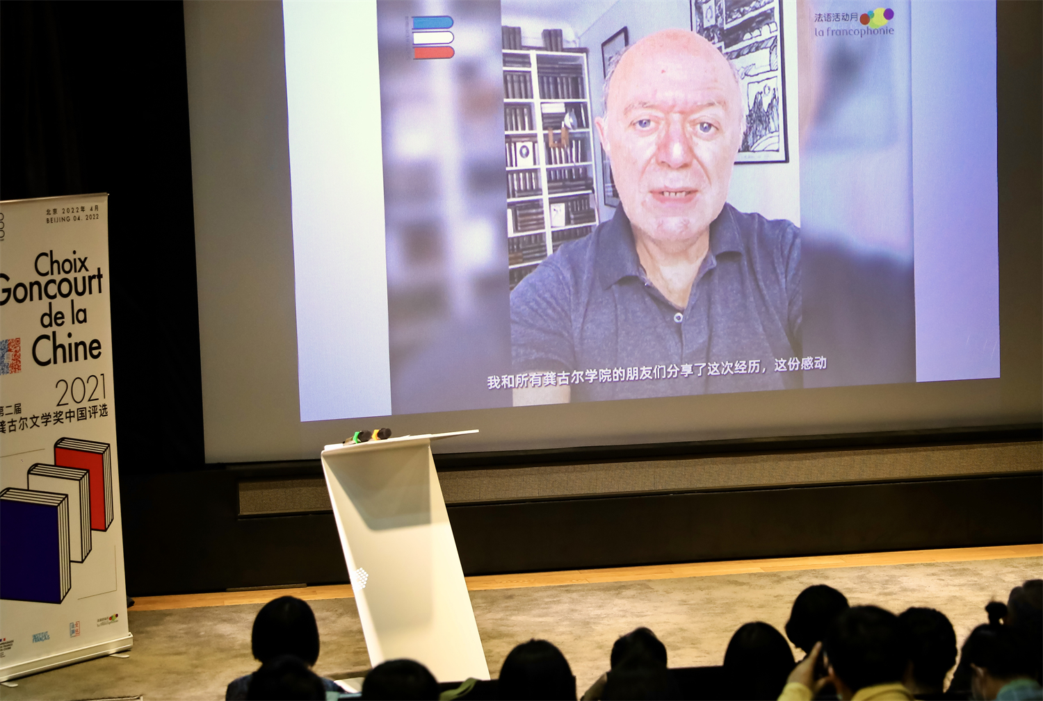 4月15日下午,“2021龚古尔文学奖中国之选”评选结果揭晓仪式在北京法国文化中心举办。“龚古尔文学奖中国之选”的专家组委会成员董强教授、秦海鹰教授和北京外国语大学车琳教授携评审团学生读者出席活动。法国著名作家、龚古尔学院成员皮埃尔·阿苏里和获奖作者穆罕默德·姆博加·萨尔分别从法国巴黎和塞内加尔发来祝贺视频和感言。法国驻华大使罗梁阁下出席并致辞。