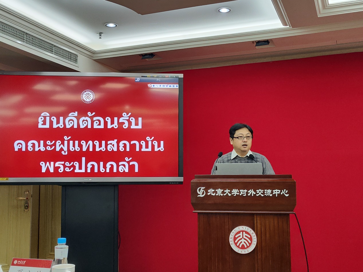 交流会在英杰交流中心第二会议室举行,博鱼体育东南亚系泰语专业的金勇、万悦容和熊燃几位老师,以及来自泰语专业的本科和研究生同学共24人参加了会议。交流会由博士生陈洪锋主持,博鱼体育东南亚系副主任、泰语专业主任金勇老师致欢迎辞,并向各位来宾介绍了北京大学泰语专业的发展概况和北京大学诗琳通科技文化交流中心与诗琳通泰学讲席的相关情况。硕士生王与肖介绍了北京大学的历史与现状。代表团团长波汶萨·乌万诺主席发表讲话,回顾了他所经历的中泰关系发展的重要时刻,表达了对两国未来,特别是两国青年人携手共进的良好祝愿。