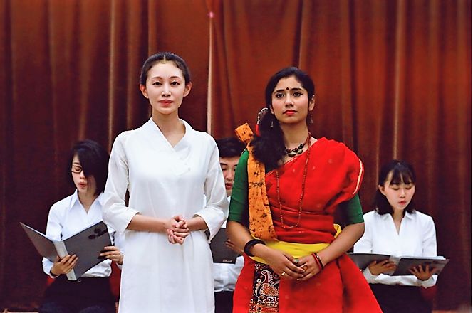 毕业于北京大学印地语专业的校友,中国的印度舞蹈专家金珊珊女士介绍了她编导泰戈尔《齐德拉》音乐舞蹈史诗剧的经验,并和她的学生们展现了古典印度舞蹈之美。印度国际大学外国语学院院长阿维杰特•森教授(Prof. Abhijit Sen)在他有关泰戈尔戏剧发展史的学术报告中,邀请国际大学艺术家高什夫妇( Avik Ghosh/Ms. Gargi Ghosh)呈现了六部泰戈尔经典戏剧的精彩片段。孟加拉国77岁的资深艺术家阿达乌尔•拉赫曼(Mr. Ataur Rahman)为大会做了“孟加拉国泰戈尔戏剧演出史”的精彩大会发言,并与印度艺术家咖尔吉•高什(Ms. Gargi Ghosh)表演了泰戈尔《红夹竹桃》的精彩片段。《红夹竹桃》是泰戈尔最有代表性的戏剧作品之一,本次演出是该剧在中国的首演,演出剧本改编自北京大学资深教授刘安武先生的译本,北京大学 “泰戈尔导读”课程团队参与组织,北京大学六位学子和玺莹仁剧团联合六位国际友人,插入多语种朗诵片段。与会者认为演出独具特色,创新性地表现了《红夹竹桃》的意义。