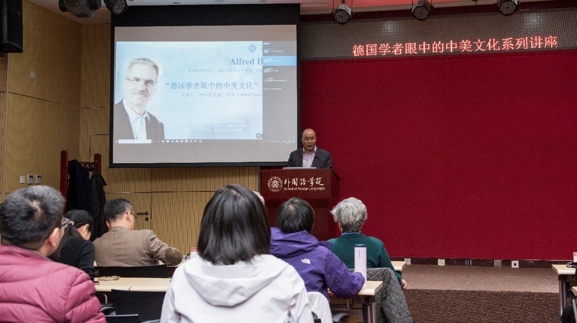 金秋十月,燕园层林尽染,硕果累累。2018年10月26日至28日,在北京大学人文学部的鼎力支持下,博鱼体育与国际合作部联合举办高端学术讲学计划,特邀欧洲科学院院士阿尔弗雷德•霍农(Alfred Hornung)教授做了题为“德国学者眼中的中美文化”的系列讲座。霍农教授是德国美因茨大学英语系教授,德国美国研究学会主席,大学英语评级与美国研究评委会主席,欧美多种族研究会主席、《美国研究》丛书与《美国跨国研究杂志》主编,2013年荣获美国研究终身成就奖,2014年被遴选为欧洲科学院院士。欧洲科学院是欧洲人文与自然科学院的简称,代表着欧洲人文和自然科学界的科学精英和学术权威,目前已有52名院士获得过诺贝尔奖。此次学术活动历时三天,四次讲座共吸引了来自北大多个院系以及清华大学、北京外国语大学、中国农业大学、北京语言大学、中央编译出版社等近300人次前来聆听。