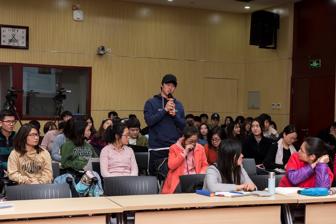 讲座还设置了现场提问交流环节,同学们就中美文化交流、“一带一路”倡议、生命写作等问题连连发问,霍农教授一一加以回应。现场互动气氛非常热烈,德国学者与中国师生碰撞出了发人深省的思想火花。通过聆听霍农教授的系列讲座,大家对中美文化、东西方文化交流、生命写作等问题有了较为全面系统的认识,有助于激发学术兴趣,优化知识结构,拓展学术视野。