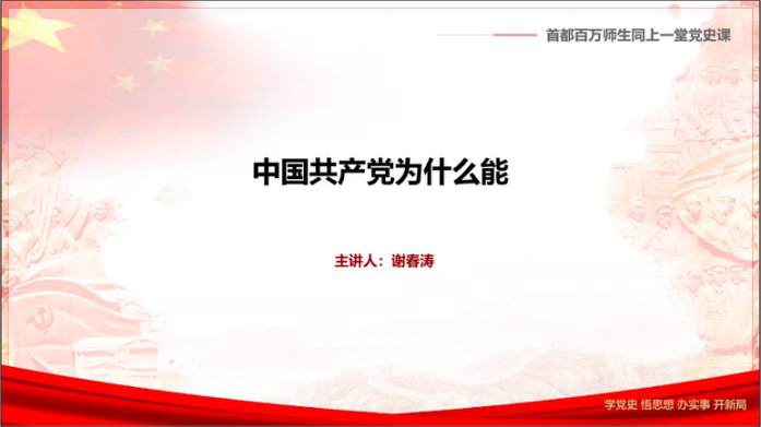 为深入学习贯彻习近平总书记在党史学习教育动员大会上的重要讲话精神, 引导党员深入学习党史,大力发扬红色传统,传承红色基因,3月31日下午,外国语学院全体学生党支部开展“首都百万师生同上一堂党史课”公开课学习活动,共同学习由中央党校副校长谢春涛主讲的《中国共产党为什么能》。16个学生党支部积极响应,结合集中观看、党小组讨论、个人学习等多种形式积极开展学习研讨。