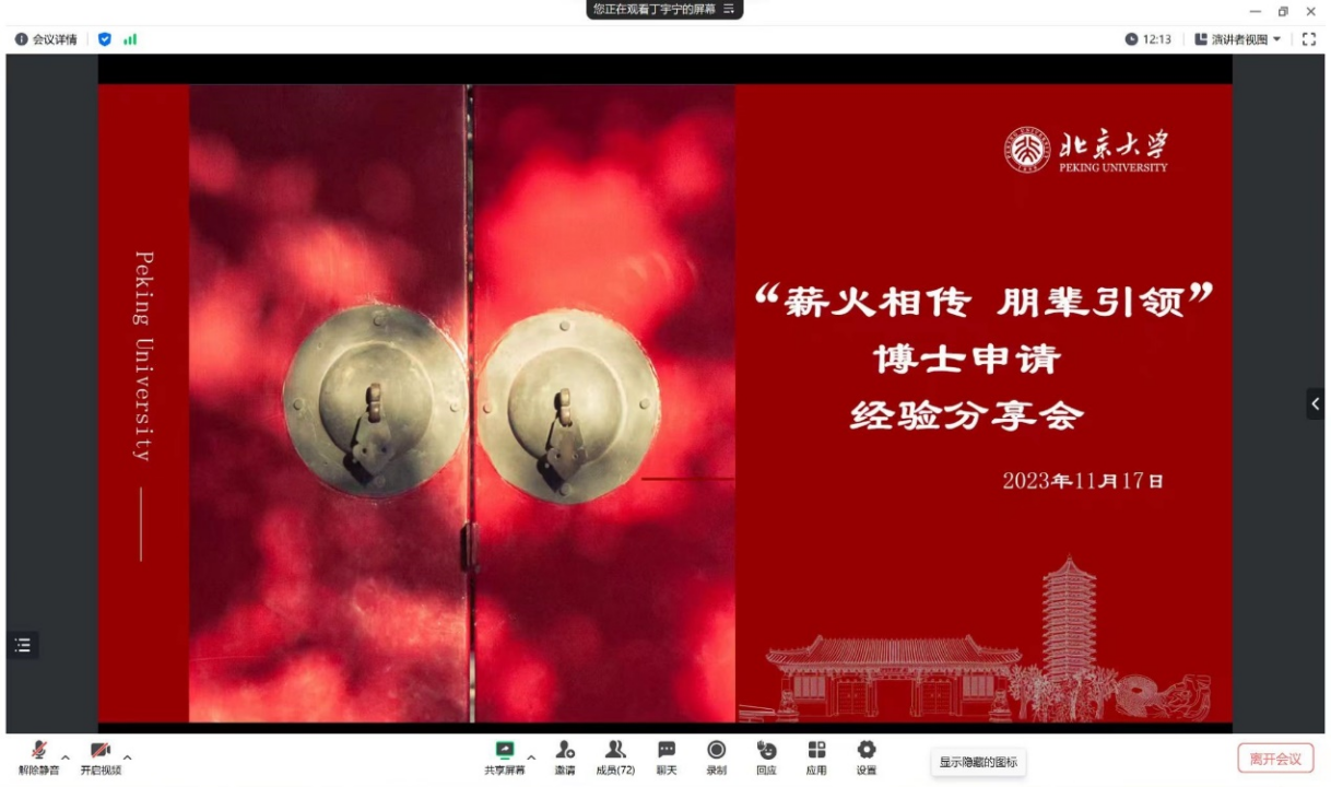 为帮助外院学子了解博士申请流程以及博士就读体验,解答有志于攻读博士学位的同学所关切的问题,博鱼体育于11月17日晚举办“薪火相传,朋辈引领”博士申请经验分享会,学院党委副书记冯美娜、辅导员丁尧出席,近百名同学参与活动。
