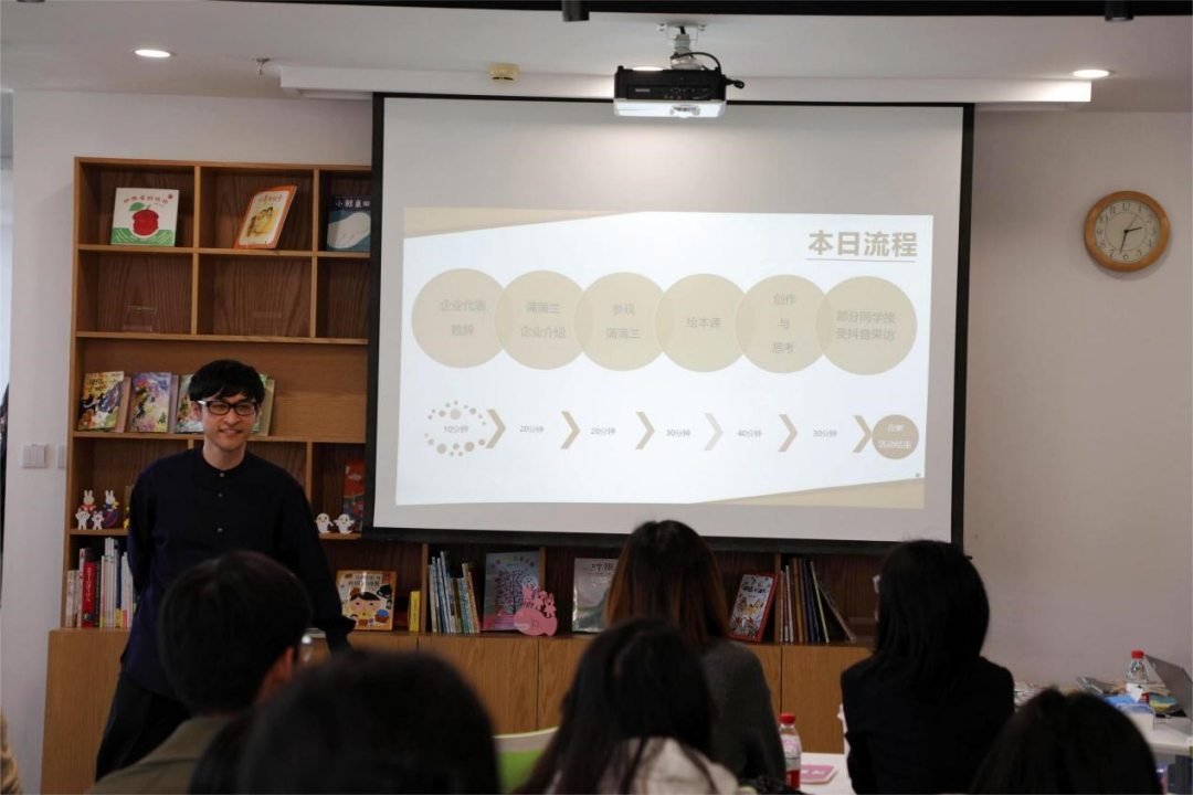 师生一行抵达后,蒲蒲兰文化发展有限公司总经理松原智德首先进行致辞,对师生们的到来表示欢迎。松原智德为大家介绍了蒲蒲兰成立至今的历史沿革以及杰出成果,继而展望了中国绘本行业发展的美好未来,深入浅出地剖析了行业趋势和机遇。同学们对蒲蒲兰的绘本文化矩阵有了更进一步的了解,也看到了蒲蒲兰在绘本出版、推广等方面的努力和成就。