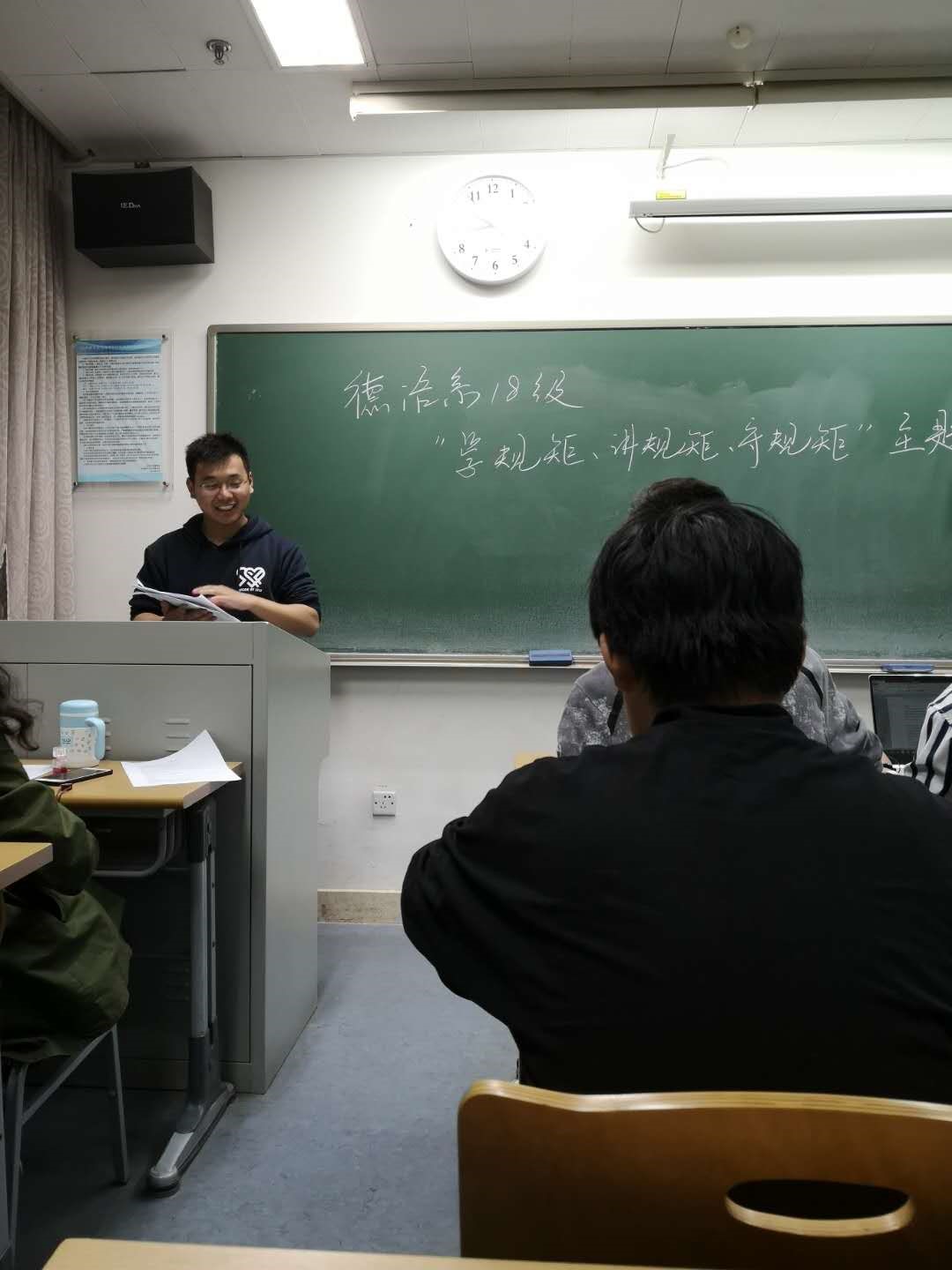 2019年4月20日20:40,外国语学院2018级德语专业本科生班在四教505举办“学规矩、讲规矩、守规矩”主题活动,2018级德语专业所有本科生均参加了班会,学习活动由班长马子函主持,辅导员李涛为同学们宣讲校规校纪。