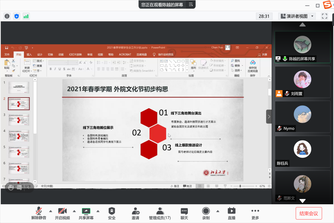 会上,各组织首先分别介绍了本年度工作计划,尤其是迎接建党100周年系列活动的策划和进展情况。本学期,在学院党委的指导下,学院将围绕迎接建党100周年这一重大节点,开展系列学习、实践、文体活动,并在活动中构建全面合作、支持和宣传体系,带领全院同学共庆建党100周年,认真学好党史,树立理想信念。各部门结合既往工作经验和部门特色,分别制定了相关活动方案,部分活动已在推进过程中。