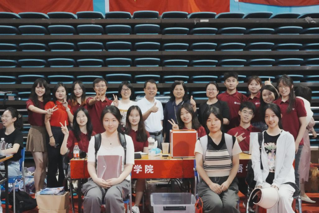 8月19日清晨5点40分,外国语学院的迎新志愿者们已经整装待发,到达邱德拔体育馆就位,进行迎新物资的准备与现场布置。邱德拔场馆内,志愿者们分发材料、拍照摄像并协助维护现场秩序,齐心协作,助力迎新工作。