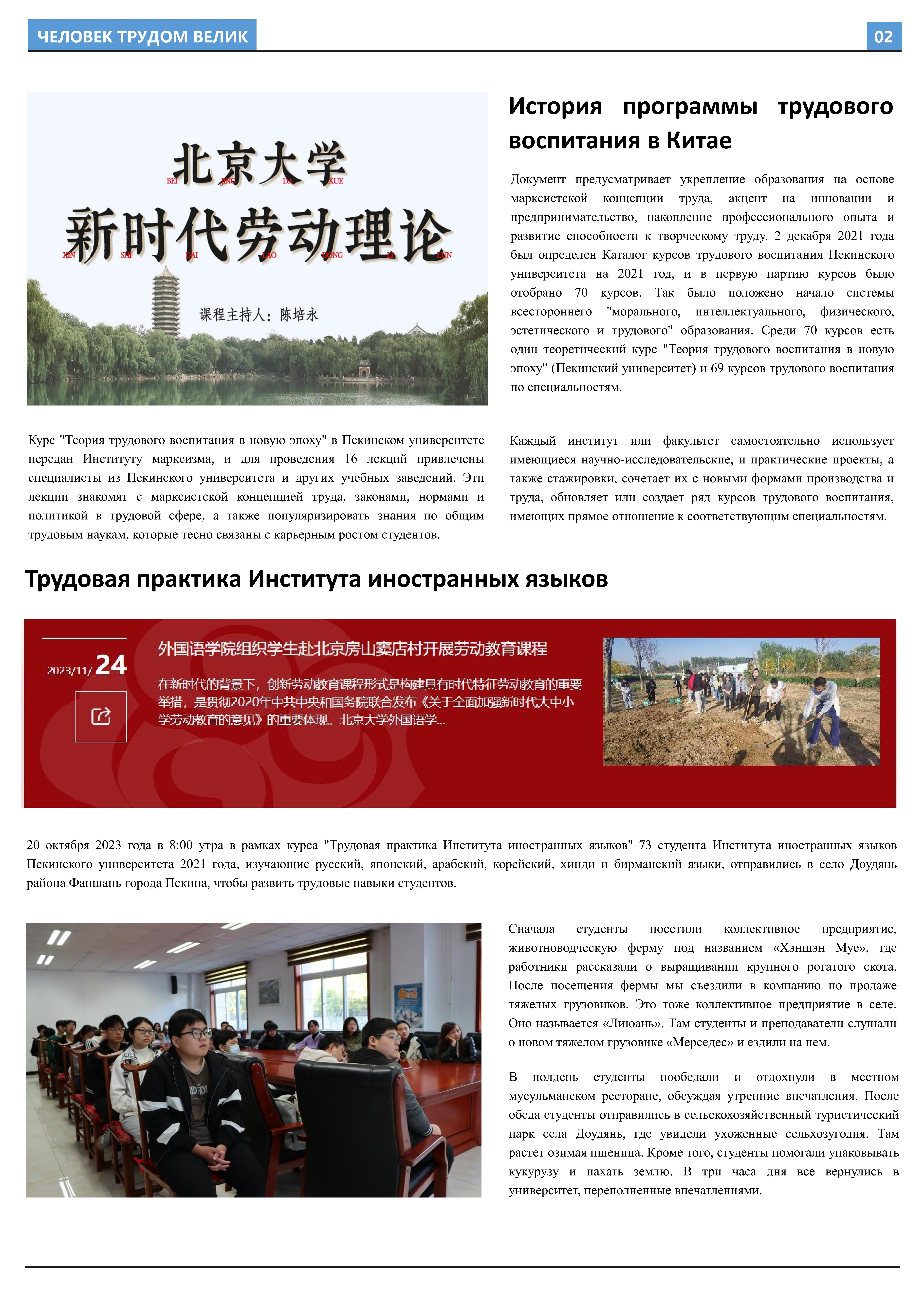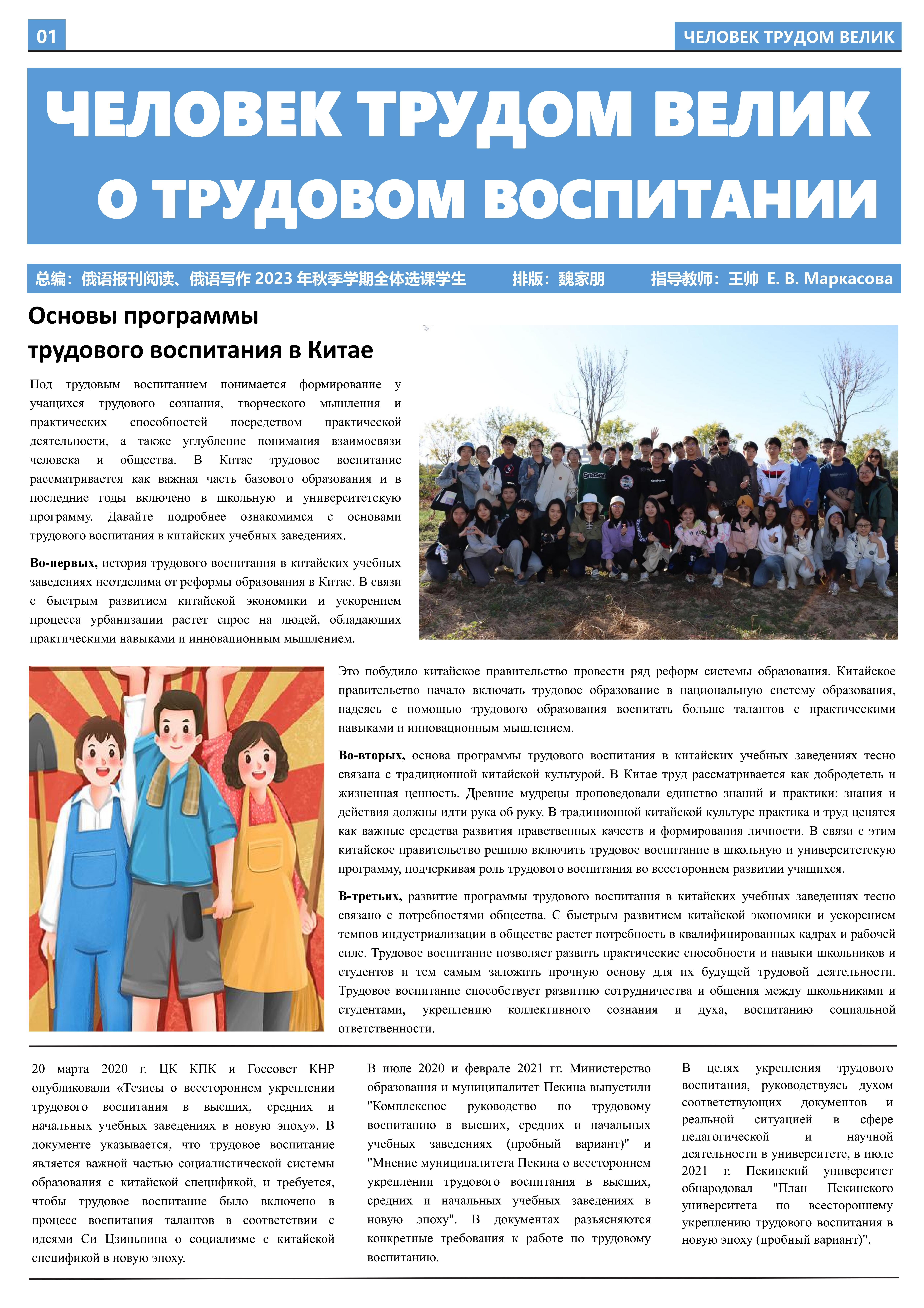 在接受劳动教育、参与劳动实践后,2023年10月至2023年12月,外国语学院2021级俄语本科生班的11名同学立足于学院平台和专业课堂(《俄语报刊阅读(上)》与《俄语写作(上)》),在两位课程主讲教师王帅和外教叶莲娜·马尔卡索娃(Елена Маркасова)的指导下,通过线上分工、小组讨论等形式商讨报纸细节,并学习使用重要概念和关键词句的俄语表达,历时近三个月,共同完成6个版面、3000余个单词数的“劳动成就人——关于劳动教育”主题报纸。报纸共分为8个大主题、13个小主题,全面介绍了外国语学院劳动教育课程的实施背景及学生参与情况,系统阐述了窦店村的历史文化与经济发展等多方面内容,并详细记录了同学们在窦店村恒升牧业畜牧养殖中心、窦店利元车业、农业观光园等劳动教学点的劳动实践与参访感受。