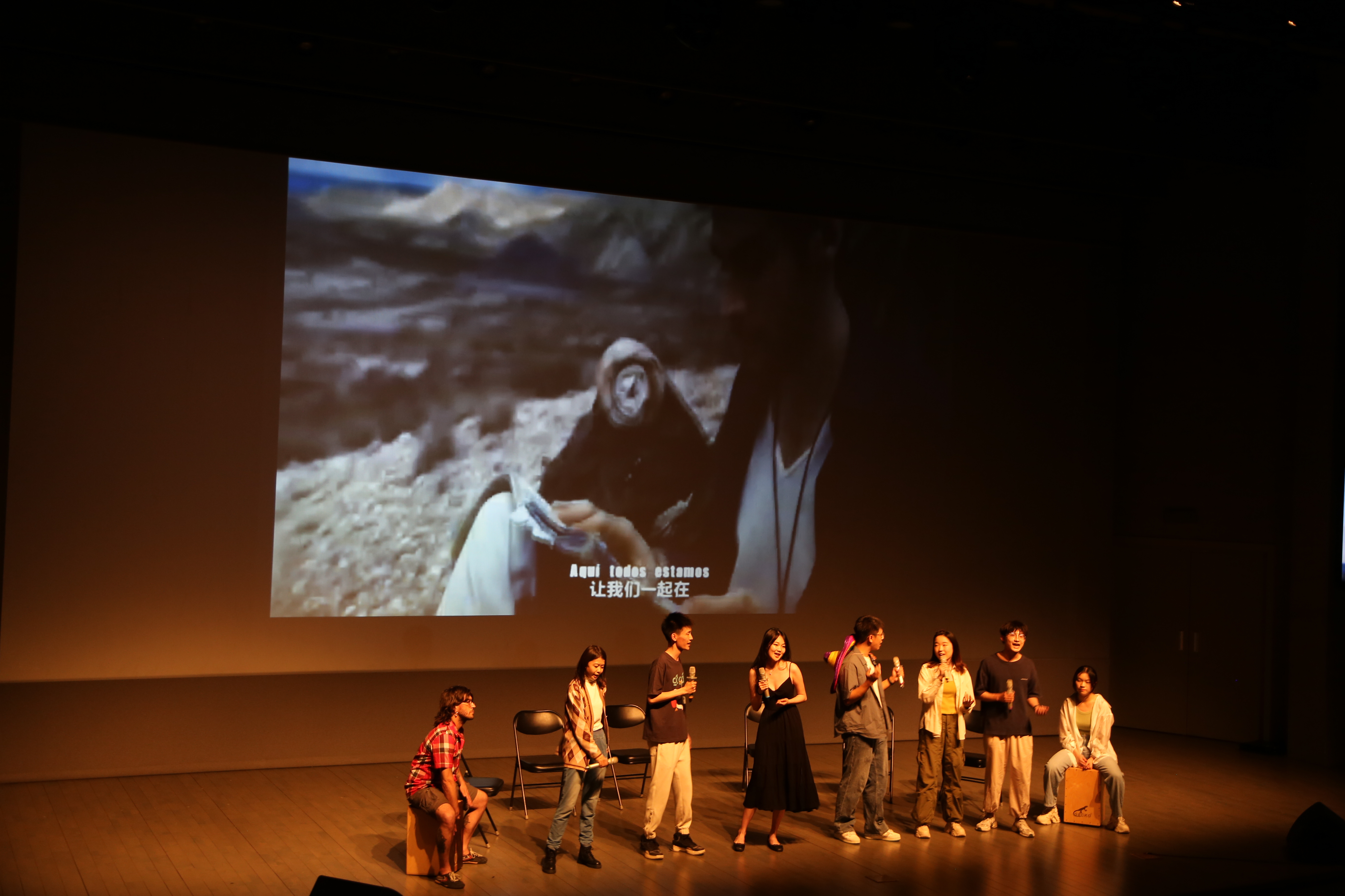 歌会开始,2022级西班牙语本科生班的师生带来歌曲《Bajo el mismo sol, recuérdame Sofía(在同一片阳光下,别忘记我索菲亚)》。无论是对爱情的追忆、对亲情的珍视还是对美好世界的憧憬,都被谱写进了轻快律动的节奏中。同学们载歌载舞,给听众带来愉快和感动。