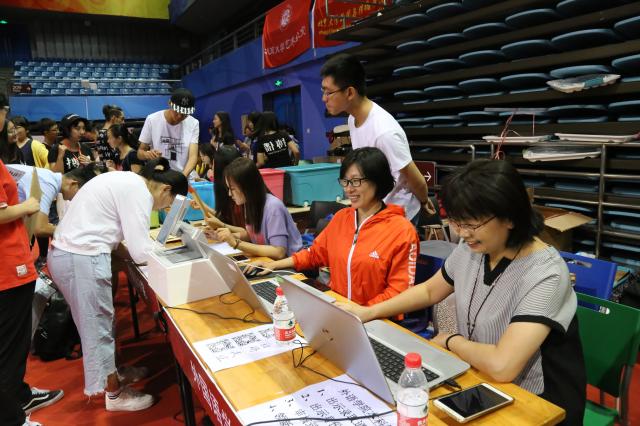 上午6:15,天刚蒙蒙亮,在学院师生共同努力下,温馨而有序的外院迎新接待站布置完毕。外国语学院副院长付志明、党委副书记王恒、教务办公室和学生工作办公室的老师以及学生志愿者们,在邱德拔体育馆内的本科生外院迎新接待站等待着新同学们的到来。