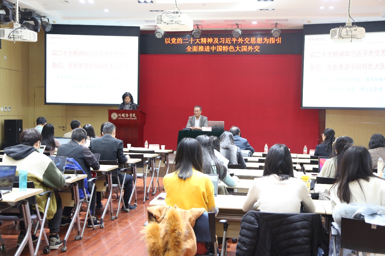 刘恩东指出以习近平同志为核心的党中央洞察和分析世界大势,作出了当今世界正处于百年未有之大变局的重大战略判断,为中国赢得了战略主动和历史主动。党的二十大报告指出“我国发展进入战略机遇和风险挑战并存、不确定难预料因素增多的时期”,当前世界不稳定、不确定、不安全,但也正在发生大发展、大变革、大调整。我们要做好应对外部环境变化的思想准备和工作准备,同时保持战略定力和历史耐心,凝心聚力有所作为。随后,刘恩东系统介绍了习近平外交思想的诞生背景,框架内容与新时代中国特色大国外交的发展历程。他强调习近平外交思想是习近平新时代中国特色社会主义思想的重要组成部分,是新时代中国对外工作的根本遵循和行动指南。他阐述了中国要推动构建什么样的国际关系,推动构建什么样的世界以及在新形势下,中国需要什么样的外交等具体问题。