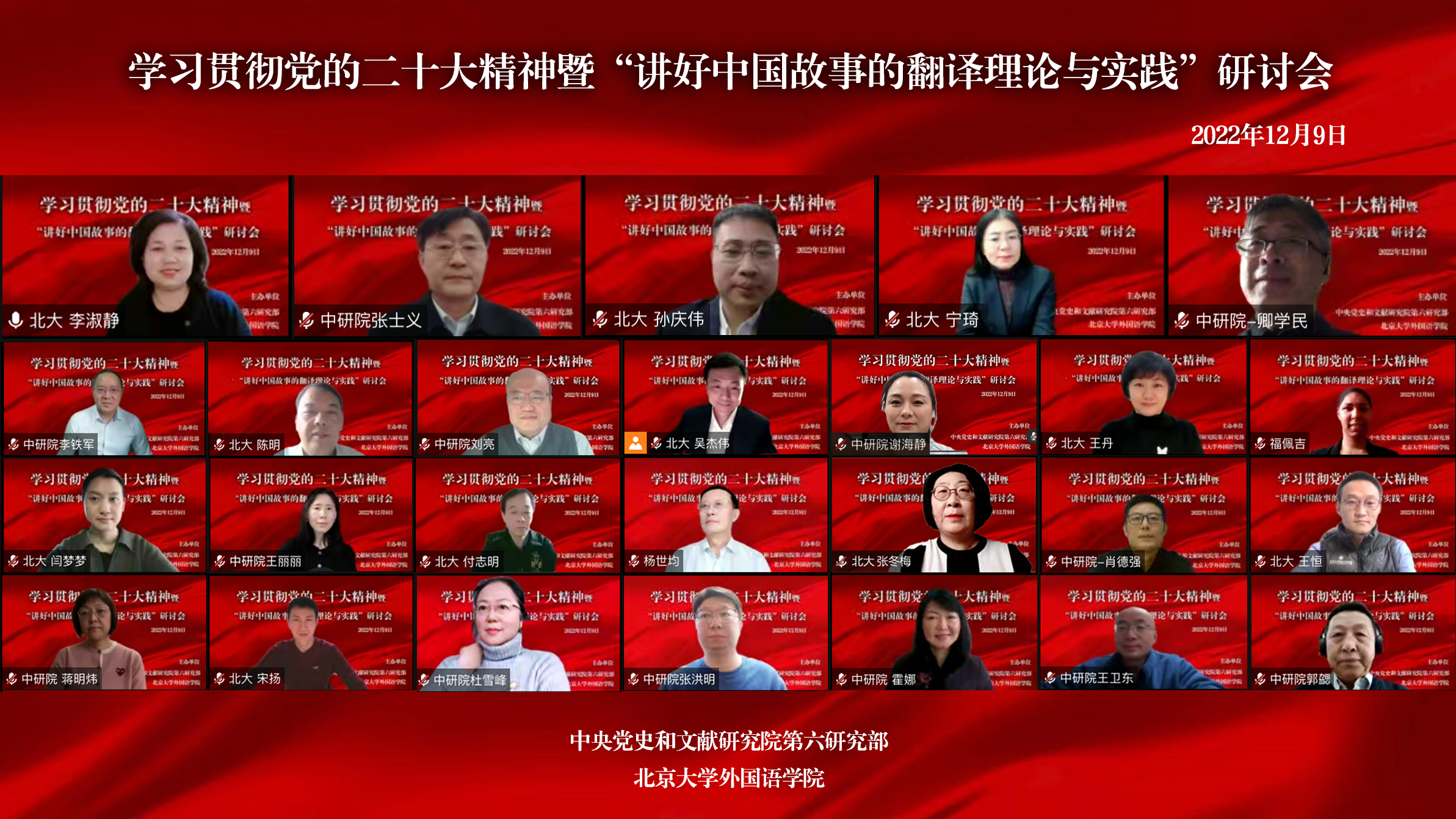 为深入学习贯彻党的二十大精神,加强国际传播能力建设和高端翻译人才培养,中央党史和文献研究院第六研究部与博鱼体育联合举办了学习贯彻党的二十大精神暨“讲好中国故事的翻译理论与实践”研讨会。会议于12月9日下午在线上举行。中央党史和文献研究院第六研究部主任张士义,北京大学党委常委、副校长孙庆伟,北京大学党委副书记、副校长宁琦,博鱼体育院长陈明等出席会议。博鱼体育党委书记李淑静主持开幕式。中央党史和文献研究院第六研究部全体在职人员和外国专家、博鱼体育师生共160余人相聚云端。