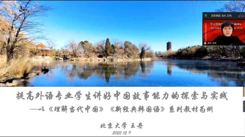 博鱼体育副院长、朝(韩)语系教授王丹从教材编写角度分享了个人的育人理念与心得体会。她认为加强国际传播能力建设具有重大现实意义,在此背景下,必须着力提高外语专业学生讲好中国故事的能力。外语教材建设的重要性与可行性被进一步凸显。王丹通过介绍《理解当代中国》系列教材、《新经典韩国语》系列教材的编写工作,生动地展示了将中国故事融入外语教材的基本原则、探索历程与实践路径。她希望外语专业教师能够以教材、课程为阵地,秉持全方位融入、全过程渗透,无处不育人、无处不思政的理念,实现价值引领、知识传授、能力培养相统一,将“讲好中国故事”理念落到实处,为提高学生“讲好中国故事”能力作出应有贡献。