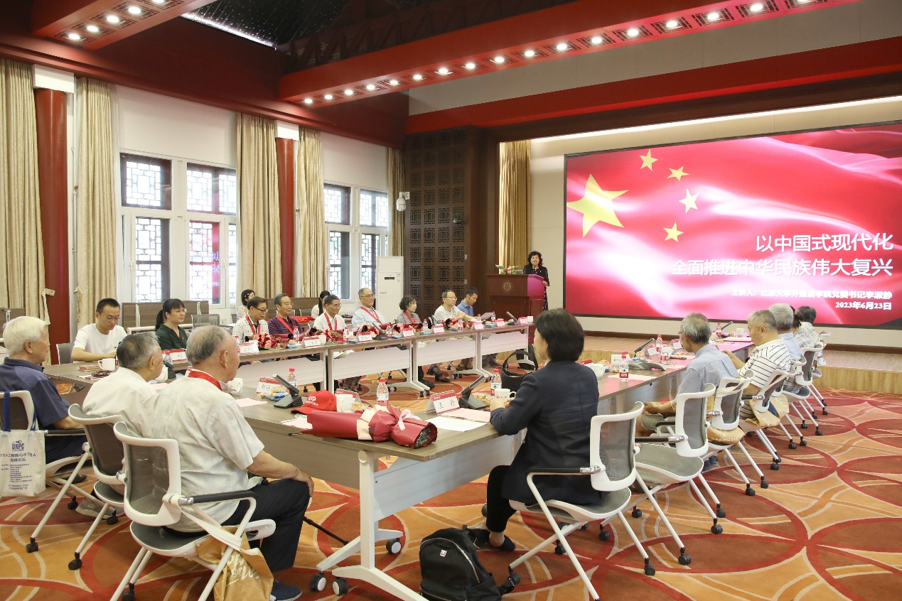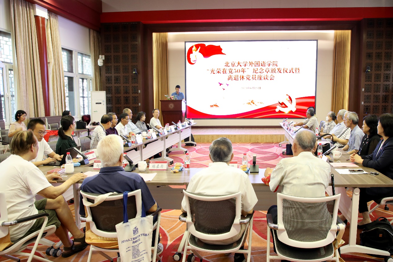 2023年6月23日上午,外国语学院“光荣在党50年”纪念章颁发仪式暨离退休党员座谈会在民主楼208多功能厅举行北京大学主题教育第三指导组组长关海庭、外国语学院党委书记李淑静和党政领导班子成员以及获颁纪念章党员、老党员代表、劳模代表、离退休党支部书记和支部委员等20余人参加了活动。