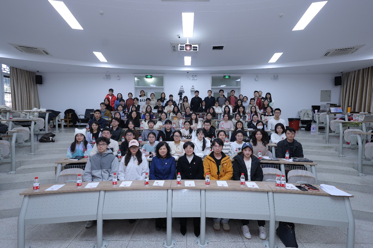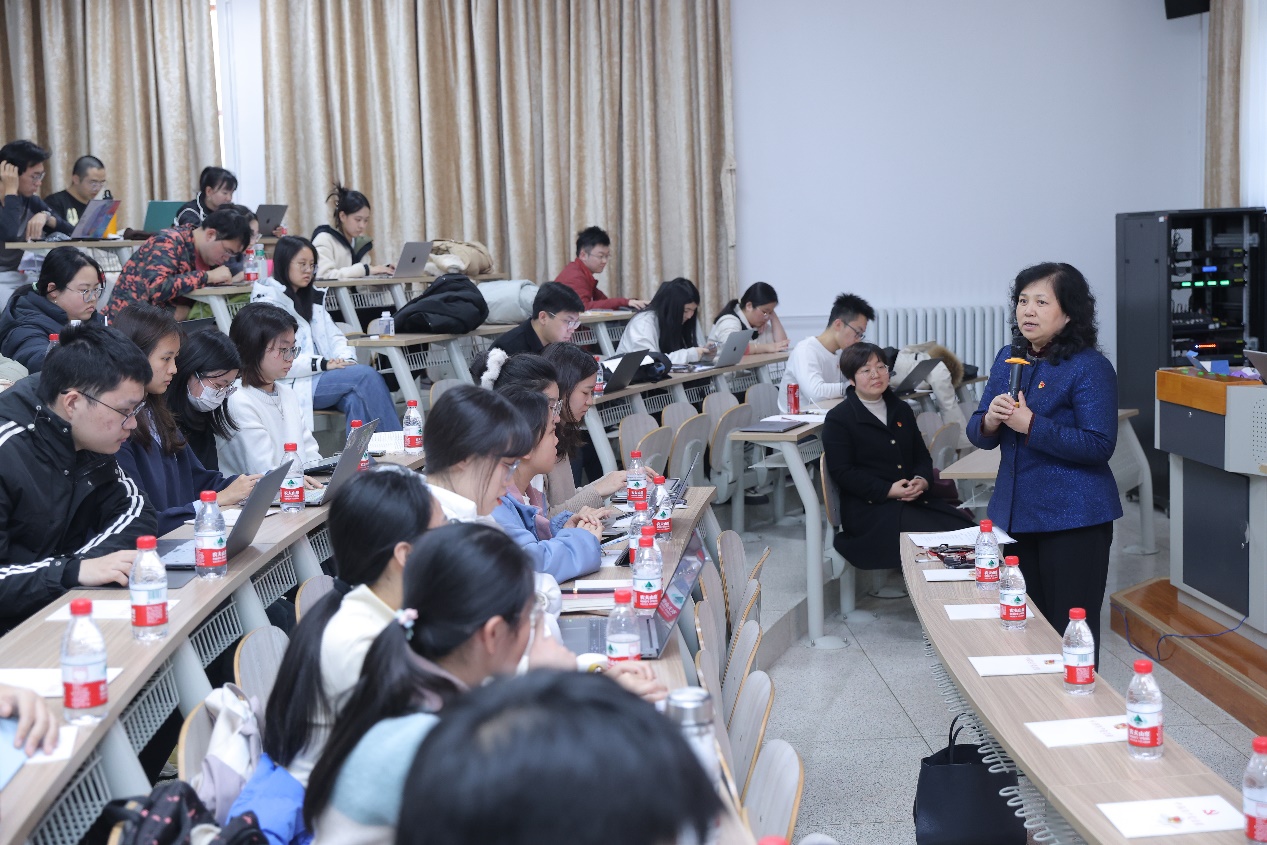 随后,烟台大学外国语学院党总支书记姜丽岳应邀作专题授课。她以红色胶东现象为切入点,生动讲述了革命先烈的英勇事迹和胶东地区在中国革命历史中的重要地位。姜丽岳认为,地域文化的鲜明特质与红色文化的引领提升是胶东红色现象形成的关键因素。她强调,习近平总书记指出“以中国式现代化全面推进强国建设、民族复兴,是新时代新征程党和国家的中心任务。”作为党员要永远保持与人民群众的血肉联系,常怀“民族复兴有我在”的使命担当。报告声情并茂,不仅让听众深刻感受到了胶东人民前赴后继、初心永驻、砥砺前行的基因与品质,也进一步激发了师生党员的爱国热情和责任担当。