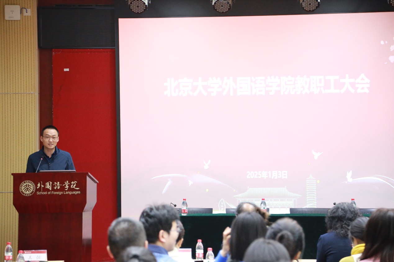 2025年1月3日下午,外国语学院2024年度教职工大会在新楼501多功能厅举行。党委书记李淑静、院长陈明与党政领导班子成员出席并作工作汇报,全院100余名教职工参加。会议由副院长王恒主持。