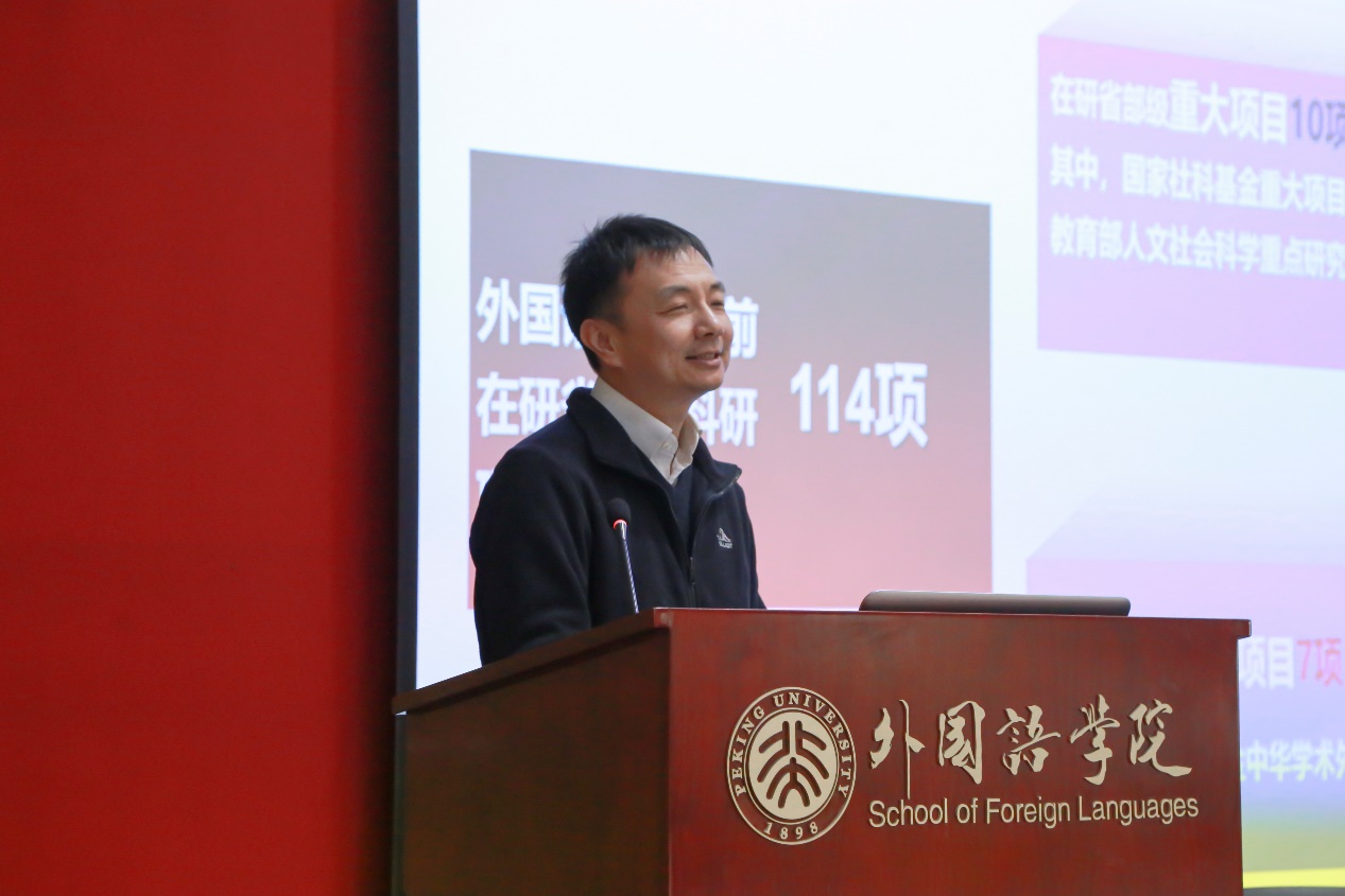 院长陈明作学院学科建设与人才工作汇报。陈明表示,2024年学院紧密围绕北京大学“学科质量年”战略目标,深入贯彻落实党的二十届三中全会精神,锚定2035年建成教育强国战略目标,持续推进“学科质量年”各项工作,以顶尖学科建设带动学科实力的整体提升。2024年,本学科保持稳步发展的良好态势,欧美和东方语言文学研究成就斐然,西方叙事学研究、古代东方语言文献与文学研究国际领先。面向2030年目标,学院制定一流外国语言文学学科建设“路线图”,以推进外语学科在理论创新、文化传承和区域国别研究领域的高质量发展。学院高端人才引领队伍建设方面取得新突破,评估体系不断完善。学院继续加大对青年学者的支持力度,通过精准服务和积极引导,有效促进学科交叉融合,推动中青年学者尽快成为教学和科研骨干和学科带头人,充分激发教师团队活力。