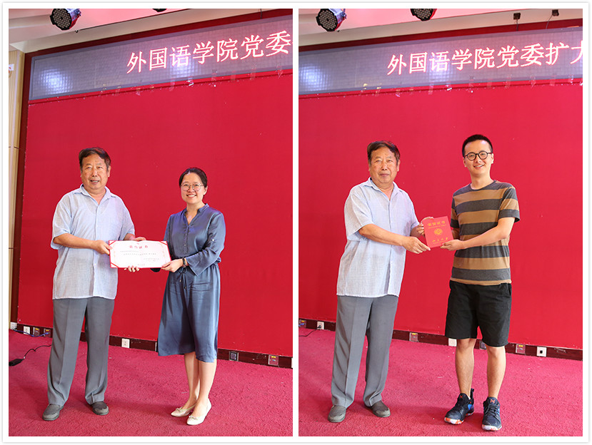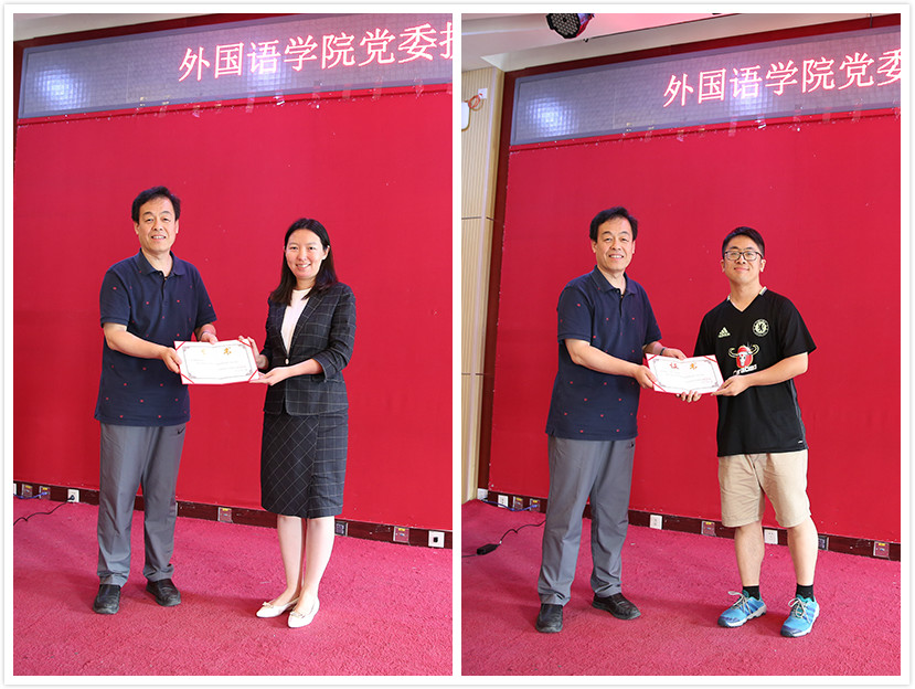 (学院党委委员、副书记王恒向评为2018年外国语学院优秀共产党员的学生党员颁发获奖证书)