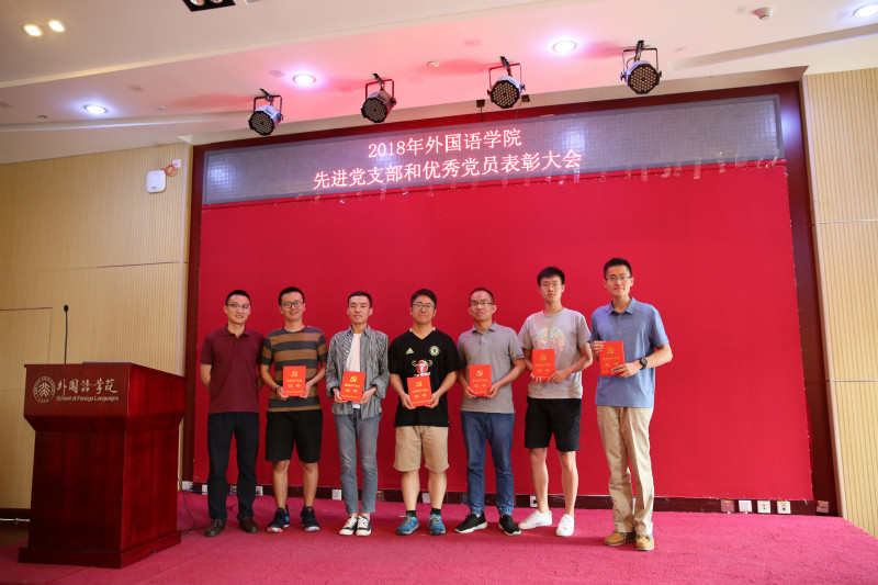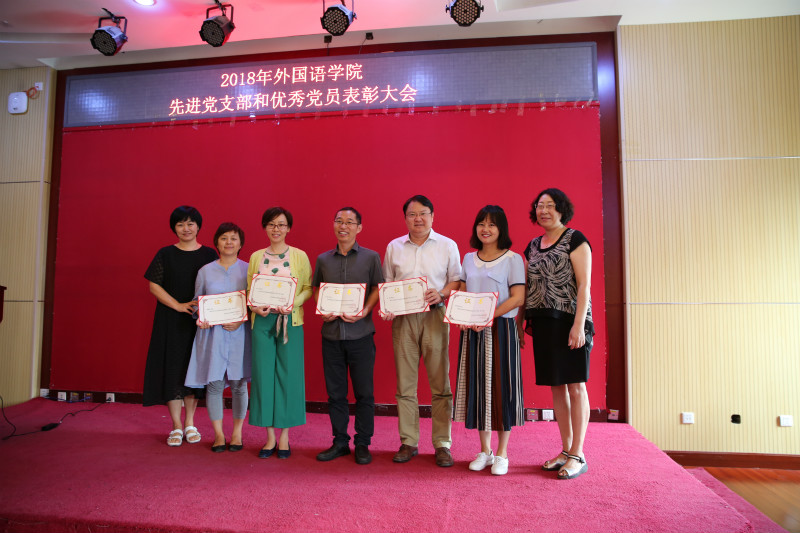 (学院党委委员王丹、张冬梅向评为2018年外国语学院优秀共产党员的刘迪南、高博、马乃强、马剑、祝洁琼颁发获奖证书)